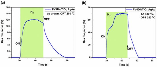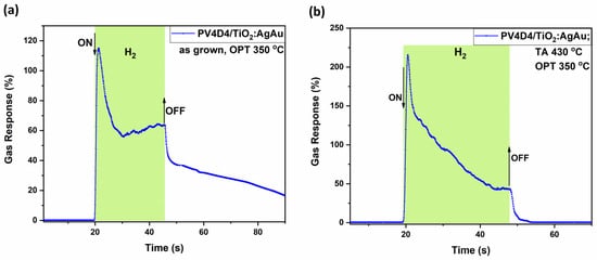 Dynamic response of the hybrid sensors based on TiO2 layers thermally annealed at 450 °C to hydrogen gas measured at an operating temperature of 350 °C with thermally treated and untreated polymer coatings. Samples with untreated polymer coating, #1, (a); and # 2 with polymer coating thermally treated at 430 °C (b).
