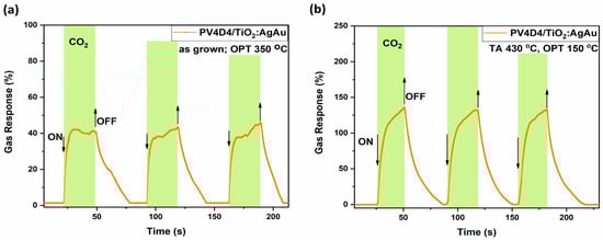 Dynamic response of the hybrid sensors based on TiO2 thermally annealed at 610 °C to carbon dioxide at different operating temperatures, with thermally treated and untreated polymer coatings atop. (a) Untreated polymer coating, OPT 200 °C; (b) polymer coating thermally treated at 430 °C, OPT 150 °C.