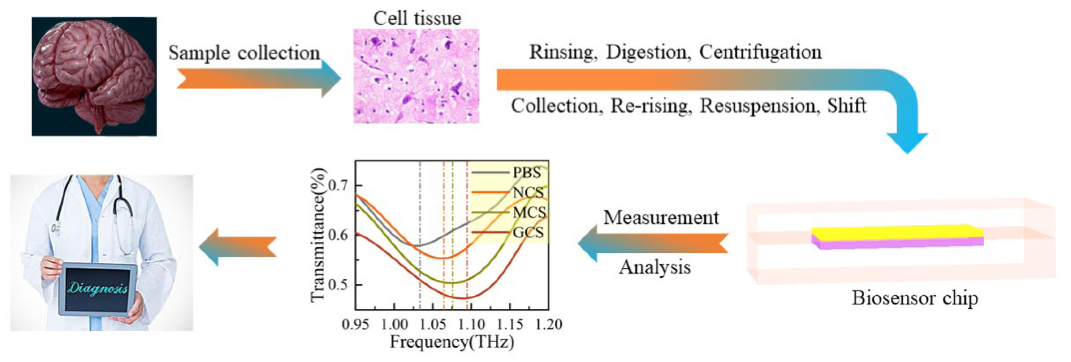 - Zhang, C.; Xue, T.; Zhang, J.; Liu, L.; Xie, J.; Wang, G.; Yao, J.; Zhu, W.; Ye, X. Terahertz Toroidal Metasurface Biosensor for Sensitive Distinction of Lung Cancer Cells. Nanophotonics 2021, 11, 101–109. [Google Scholar] [CrossRef]