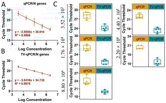 Data revealed highly consistent analytical performance between TV-qPCR and conventional systems in RT-LAMP detection: (1) Both covered identical linear ranges (3.52 × 103–2.2 × 106 copies/μL); (2) Standard curve regression coefficients (TV-qPCR R2 = 0.992; conventional R2 = 0.995) satisfied clinical requirements (Figure 6A,B); and (3) Cycle threshold standard deviation ranges (0.35–1.82 vs. 0.28–1.64, respectively) demonstrated comparable reproducibility (Figure 6C).