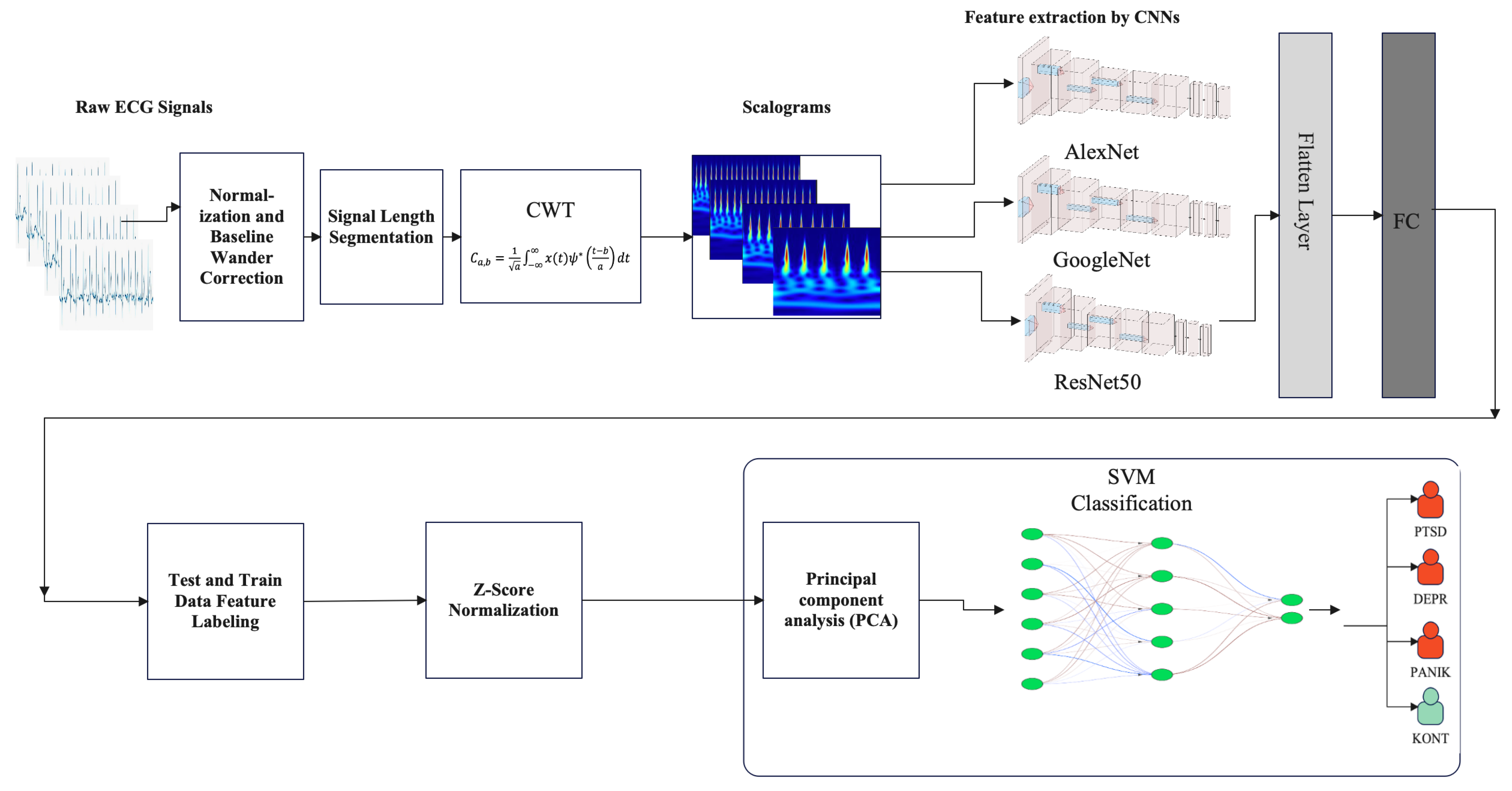 To address these critical research gaps, this study introduces the first comprehensive framework for ECG-based multi-class psychiatric disorder classification through two key innovations. First, we develop a deep learning system capable of simultaneously differentiating PTSD, depression, panic attacks, and healthy control states from ECG signals, advancing beyond existing binary classification approaches to clinically relevant differential diagnosis. Second, we propose a novel hybrid CNN-SVM architecture that combines ResNet50’s automatic feature extraction with SVM’s robust classification performance, enhanced through PCA for optimal dimensionality reduction. This hybrid approach transforms CWT-derived scalograms into discriminative features that outperform individual CNN or traditional machine learning methods. Our framework employs rigorous 5-fold cross-validation and explores multiple ECG segment lengths to optimize diagnostic accuracy.