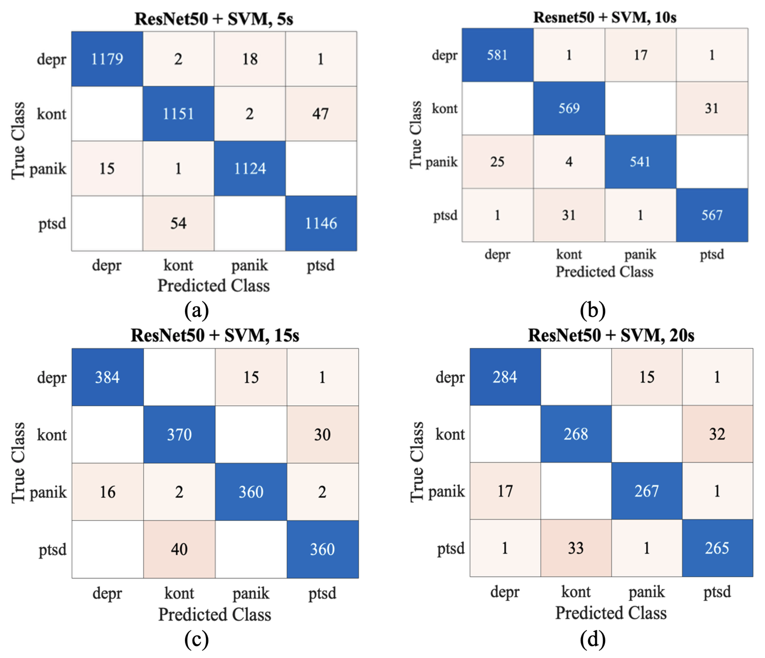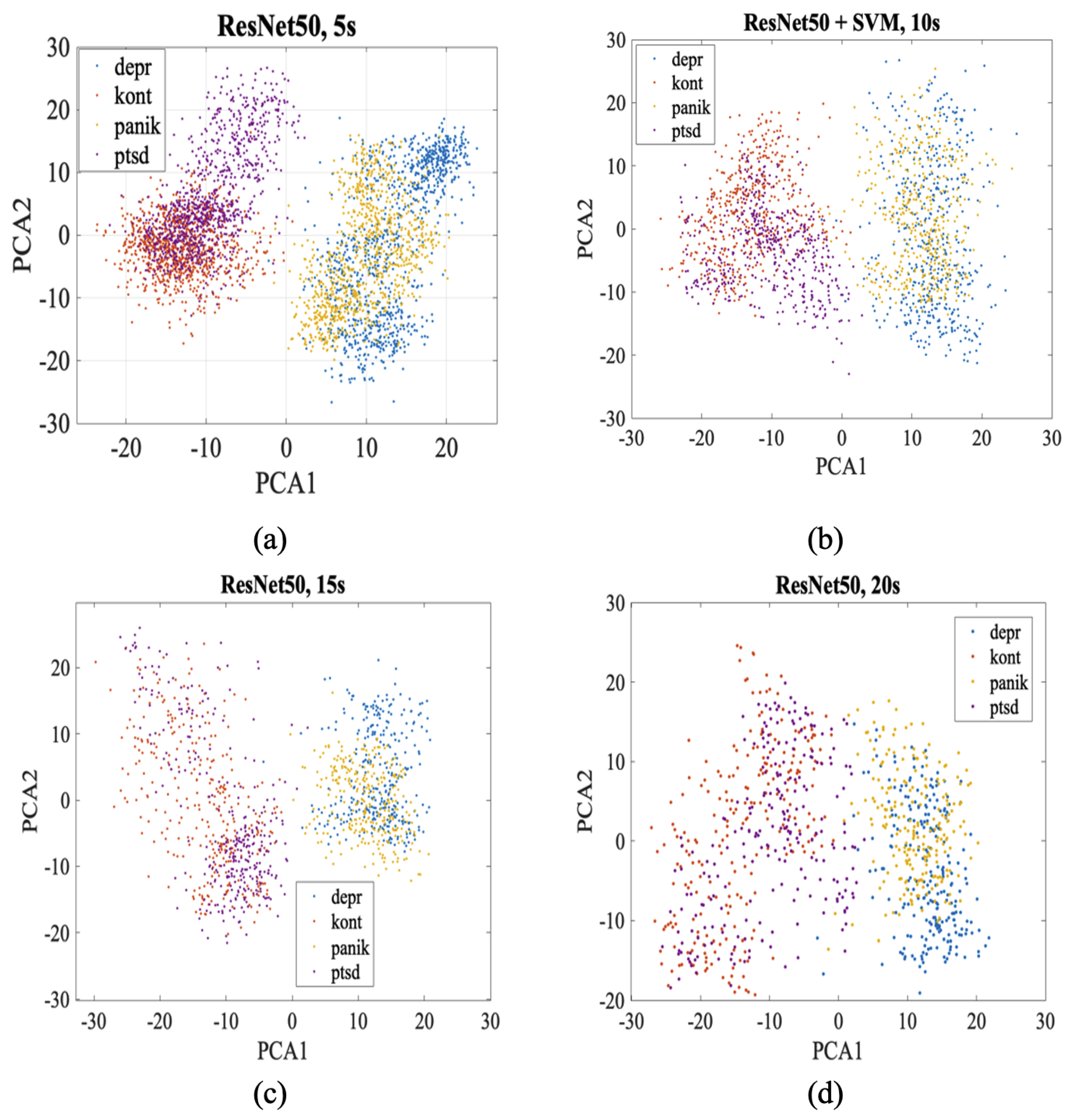 Figure 3 illustrates the PCA visualization of ResNet50 features across different ECG segment lengths, revealing the critical impact of temporal resolution on classification performance. In 5-s segments (a), the four psychiatric classes form remarkably distinct clusters in PCA space, with depression (blue) creating a compact cluster in the lower right, control group (red) concentrated in the lower left, panic attack (yellow) positioned in the middle right, and PTSD (purple) clearly separated in the upper left region. As segment length increases to 10 s (b), class separations remain preserved but cluster boundaries begin to soften slightly. At 15 s (c), inter-class distinctions show more pronounced degradation, particularly between control and depression groups, while PTSD maintains its characteristic position. In 20-s segments (d), inter-class overlaps reach maximum levels with all groups exhibiting more diffuse distributions, though general class tendencies are still preserved. This progressive degradation emphasizes that cardiovascular manifestations of psychiatric disorders require short-duration, high-resolution analysis for optimal discrimination.