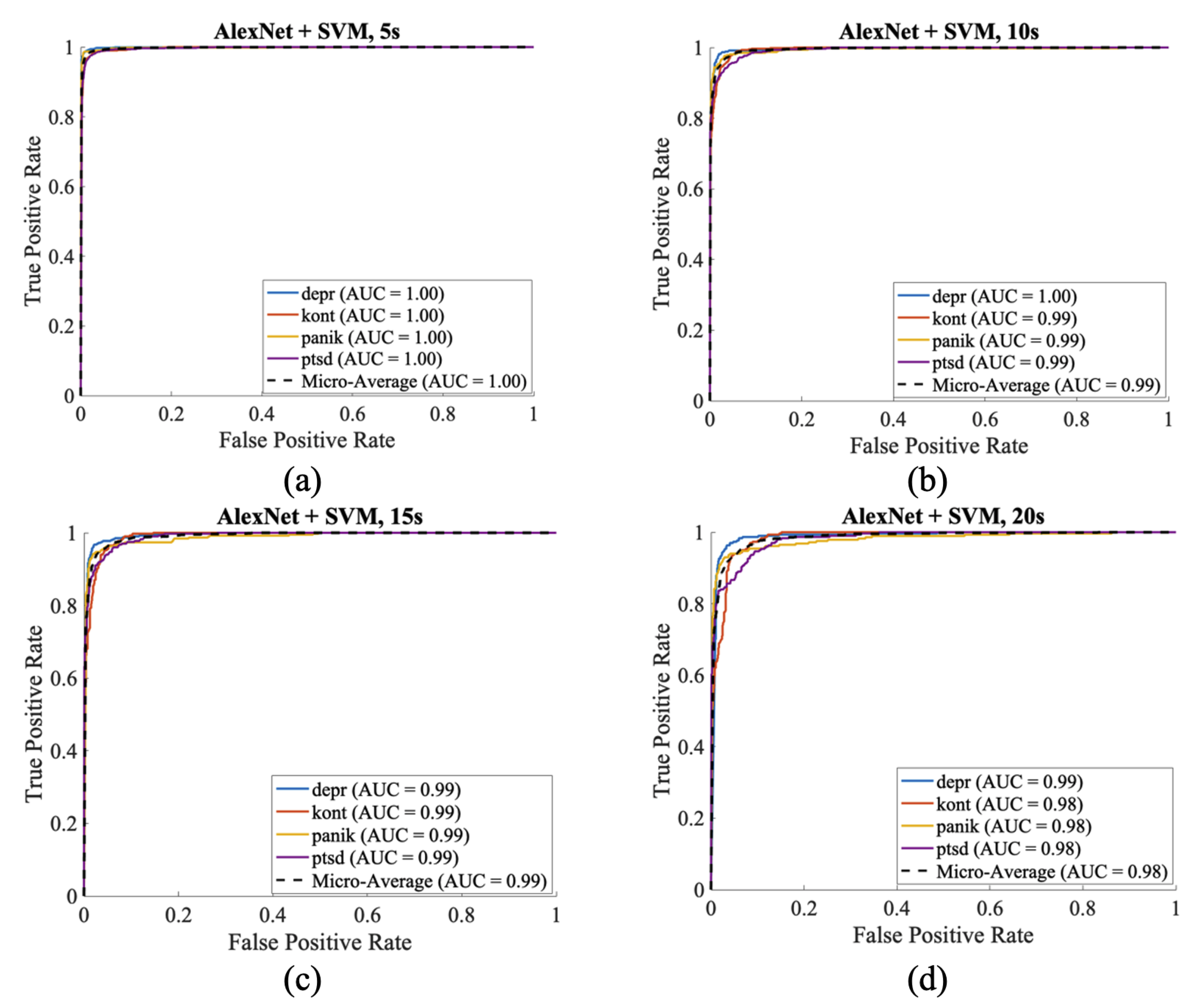 For AlexNet + SVM, the best performance was obtained with 5 s segments, achieving 97.26% overall accuracy, 0.96 MCC, and a micro-AUC of 1.00 (