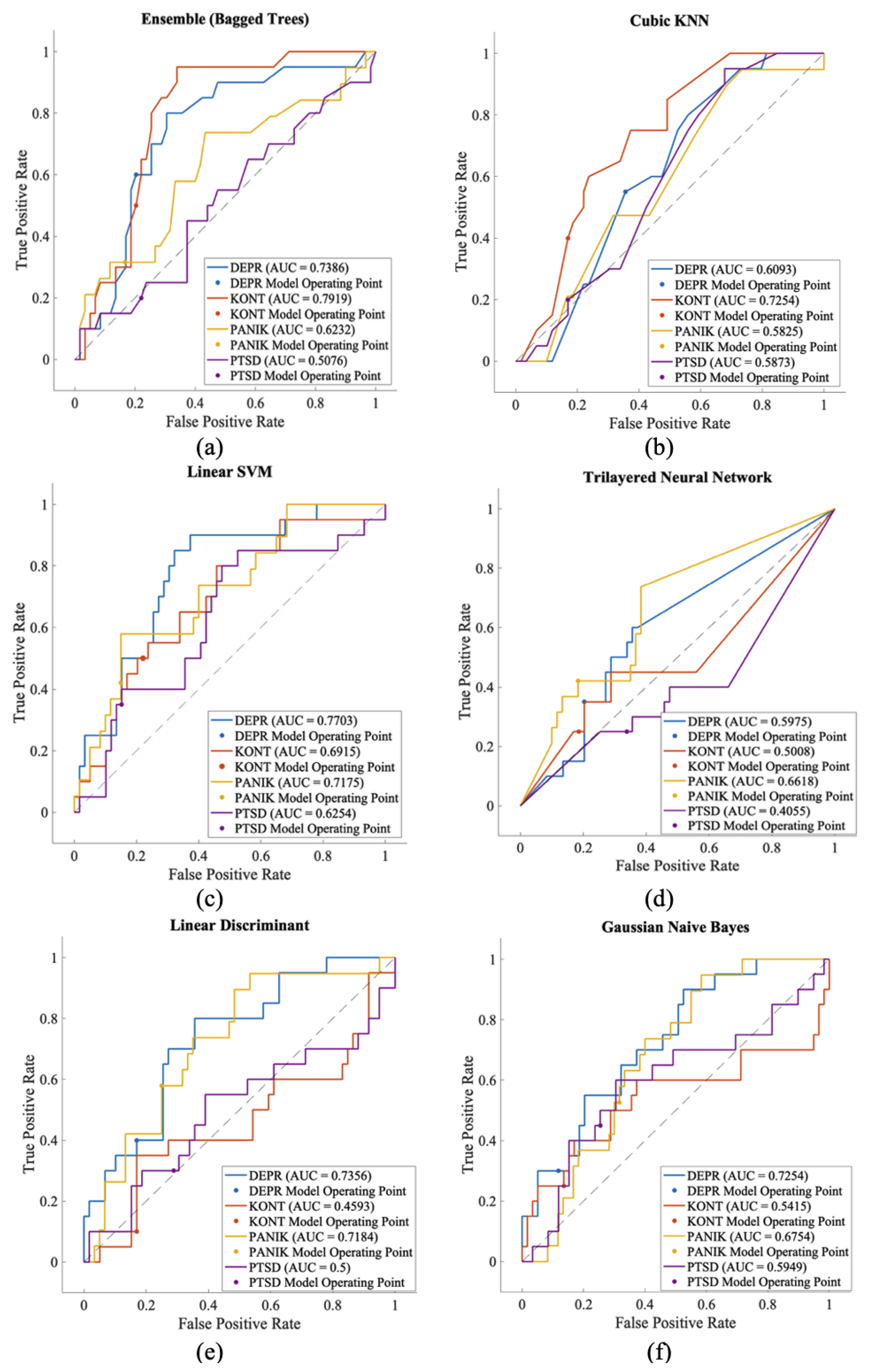 Figure 6 clearly demonstrates the performance differences between classes. AUC values range from 0.405 to 0.791. The highest performance was obtained for the control class in the ensemble model with an AUC of 0.791. The lowest performance was observed for the PTSD class in the Three-Layer Neural Network with an AUC of 0.405. This wide performance range reflects the complexity of multiple classifications. These results demonstrate the necessity of deep learning for this complex multi-class psychiatric classification task, as our proposed hybrid CNN-SVM approach achieves approximately twice the accuracy compared to conventional methods.