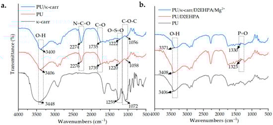 The FTIR spectra of κ-carrageenan, PU, and PU/κ-carr membranes are shown in Figure 1a. A broad O–H stretching band observed at 3448 cm−1 in κ-carrageenan shifted to 3406 cm−1 in PU and 3400 cm−1 in PU/κ-carr, indicating modified hydrogen bonding due to polyurethane formation. Urethane linkages (–NH–COO–) are formed by the interaction of hydroxyl groups from castor oil and κ-carrageenan with isocyanate groups from TDI, as confirmed by strong C=O stretching vibrations at 1739 cm−1 and 1735 cm−1, respectively. These pathways provide the principal framework of the cross-linking network inside the PU structure [24,25]. The polymerization at 40 °C is expected to enhance the reactivity of the isocyanate group, accelerating cross-linking via urethane addition without generating byproducts [26]. The N=C=O absorption bands at 2276 cm−1 (PU) and 2274 cm−1 (PU/κ-carr) indicate residual isocyanate groups, as supported by previous findings [18,19,27]. This may be due to an imbalanced –OH/–NCO stoichiometric ratio, in which the excess has been associated with enhanced hydrophobicity of the PU [26]. The presence of bands O=S=O (1270–1230 cm−1) and C–O–C (1100–1000 cm−1) indicates that the basic structure of the polymer is preserved, while also confirming the presence of hydrophilic functional groups such as sulfate and ether, which are responsible for the inherent water affinity of κ-carrageenan [19,26].