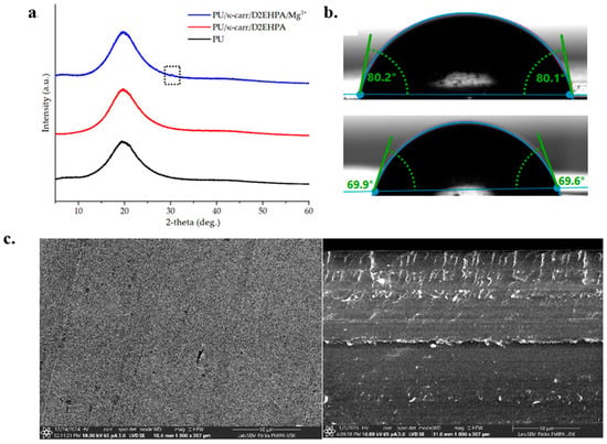 Physical characterization results of membranes. XRD patterns of PU, PU/κ-carrageenan/D2EHPA and PU/κ-carrageenan/D2EHPA/Mg2+ membranes (a); WCA measured on the surface of PU/κ-carrageenan/D2EHPA membranes before and after conditioning (b); SEM image of PU/κ-carrageenan/D2EHPA/Mg2+ membrane surface and cross-section (c).
