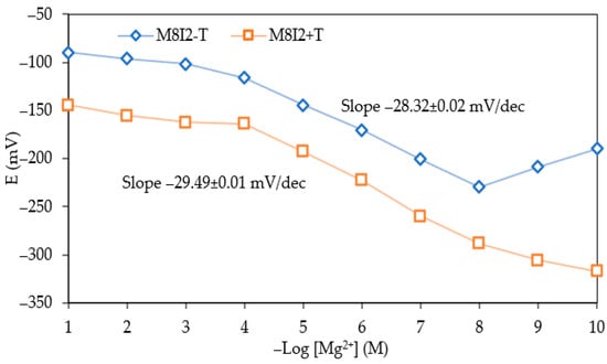 This study confirmed that the Mg2+ ion sensor matrix containing 0.0061% ĸ-carrageenan and 0.0006% D2EHPA (w/w) obtained an ideal sensitivity of 29.49 ± 0.01 mV/decade in the concentration range of 10−9–10−4 M and a determination coefficient of 0.9919. Comparison of sensitivity values based on the potential response of Mg2+ ISE optimal conditions (denoted as M8I2+T) with no TISAB (denoted as M8I2–T) is presented in Figure 3.