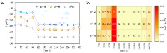 The initial stability of the Mg2+|M8I2+T ISE was evaluated by measuring the response time through potential recordings taken every 30 s for all tested Mg2+ ion concentrations (Figure 5a). A potential differential (∆E) stability may be achieved within the range of 0.1–1.8 mV between 120 and 270 s (Figure 5b). The findings are consistent with the International Union of Pure and Applied Chemistry (IUPAC) standard for potential stability limits (±1 mV) [19,38] and validate analytical assessments conducted after 120 s [39].
