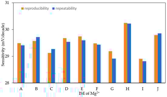 The reproducibility and repeatability of ten batches of Mg2+|M8I2+T ISE (A–J) were evaluated based on Nernstian values (Figure 6), all exhibiting sensitivity within the appropriate range for divalent ions of 28.5–30.5 mV/decade, as presented in SI; see Table S2. The average sensitivity value was 29.52 mV/decade with %RSD of 1.31%, indicating excellent repeatability. Simultaneously, the repeatability yielded an average sensitivity of 29.48 mV/decade, with an average SD of 0.15 mV/decade and a %RSD of 0.50. Both outcomes indicate the electrode’s advantageous short-term stability.