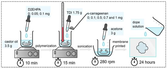 The dope solution formulations were prepared at the following combination ratios: D2EHPA, castor oil, κ-carrageenan, TDI, and acetone. The membrane composition refers to Scheme 1, which is based on the average optimized ratio as reported in a previous study [21]. Initially, D2EHPA was blended with castor oil and stirred until the mixed solution was homogeneous. Subsequently, κ-carrageenan was incorporated under continuous stirring at 40 °C, followed by the polymerization process initiated by the addition of 1.75 g of TDI at the same temperature. As much as the addition of 3 g of acetone was to eliminate entrapped air bubbles before casting onto a glass substrate. The membrane was then allowed to dry at ambient conditions for 24 h. The membrane thickness was kept constant using a fixed casting volume and identical drying conditions.