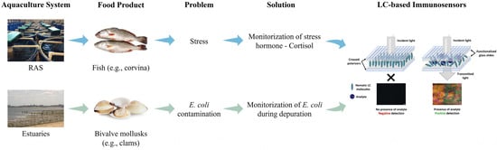 This study demonstrates the successful development and application of LC-based immunosensors for the optical detection of cortisol and E. coli in different aquaculture settings. The immunosensors exhibited high sensitivity and selectivity, enabling real-time, label-free detection of these critical analytes. The results demonstrate that LC-based immunosensors are capable of detecting cortisol in RAS water samples, supporting their potential use for assessing stress-related variations in fish populations. Similarly, the immunosensors tracked E. coli contamination in water and bivalve mollusks throughout the depuration processes, providing a rapid and reliable alternative to traditional microbiological methods.