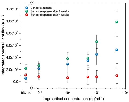 In addition, the temporal validity of these immunosensors was also evaluated. Thus, these immunosensors were analyzed in the POM at 2 and 4 weeks after their initial analysis. Figure 6 presents these results, showing that after 2 weeks, the light flux changes more noticeably at higher concentrations. After 4 weeks, the response of these immunosensors is entirely different from the initial analysis, showing virtually no change in light flux as cortisol concentration increases. This means that LC molecules are likely to reorganize over time until they align homeotropically. Therefore, the data suggest that the immunosensors exhibit a measurable response within the first 2 weeks after fabrication; however, significant temporal variations, especially at higher concentrations, indicate that signal stability remains a critical aspect to be further optimized.