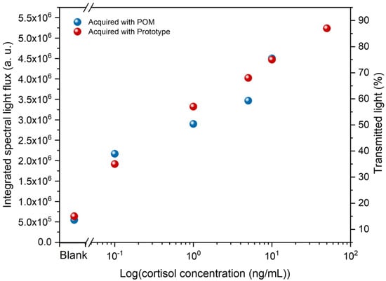 The same immunosensors tested in section A were analyzed using the novel prototype that rapidly measures the percentage of transmitted light through a specific sensor region, providing results within seconds. To evaluate the response of this prototype, a comparison between the prototype’s results and the POM analysis was performed, as presented in Figure 9. Each analysis shows an increase in light flux (POM analysis) and transmitted light (prototype analysis) with increasing cortisol concentration. There is only a slight difference between 1 ng/mL and 5 ng/mL, with the transmitted light slightly higher than the light flux. However, the overall responses were similar, suggesting that the prototype can consistently indicate the presence of cortisol.