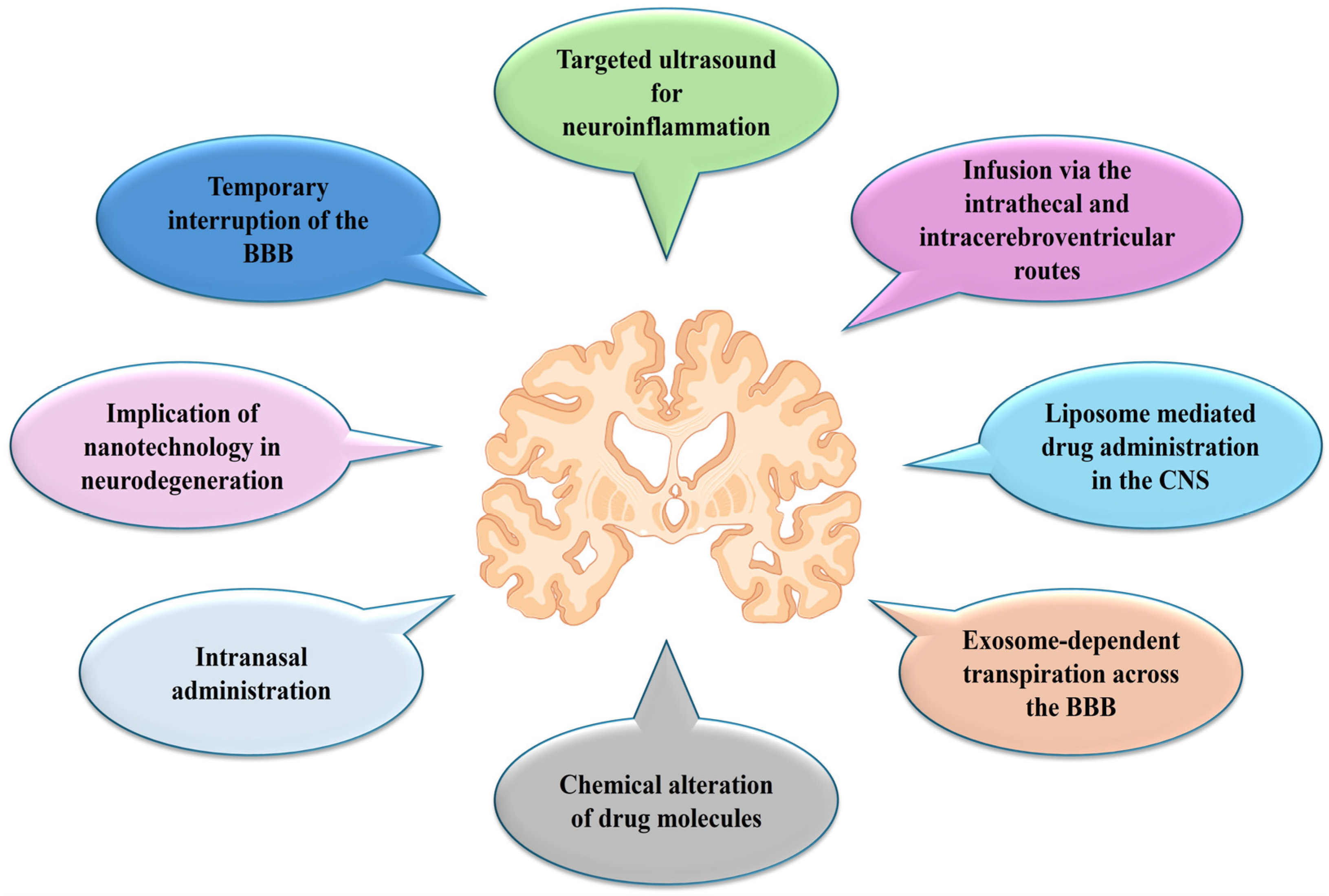 - Zhang, X.; Fu, M.; Wang, Y.; Wu, T. Strategies for Delivering Drugs across the Blood–Brain Barrier for the Treatment of Neurodegenerative Diseases. Front. Drug Deliv. 2025, 5, 1644633. [Google Scholar] [CrossRef] [PubMed]