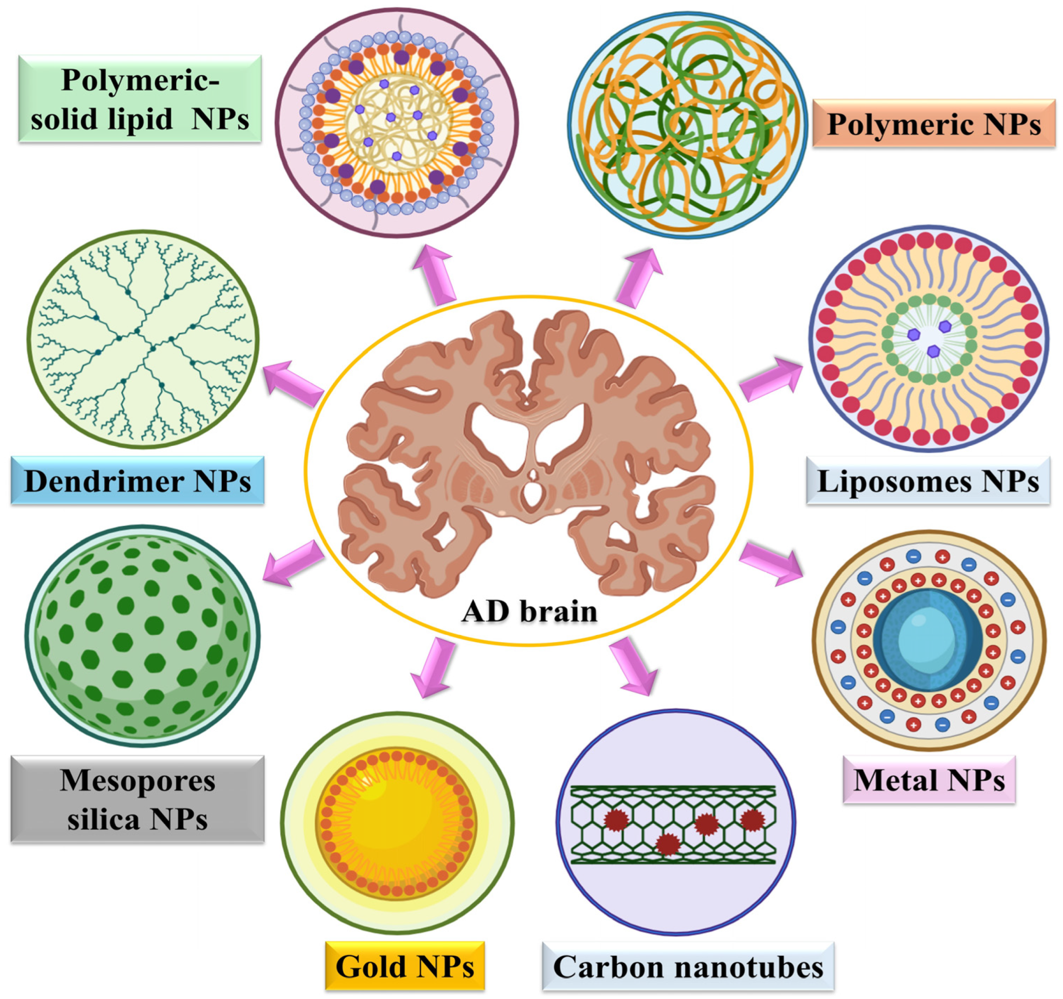 - Dong, N.; Ali-Khiavi, P.; Ghavamikia, N.; Pakmehr, S.; Sotoudegan, F.; Hjazi, A.; Gargari, M.K.; Gargari, H.K.; Behnamrad, P.; Rajabi, M.; et al. Nanomedicine in the Treatment of Alzheimer’s Disease: Bypassing the Blood–Brain Barrier with Cutting-Edge Nanotechnology. Neurol. Sci. 2025, 46, 1489–1507. [Google Scholar] [CrossRef] [PubMed]