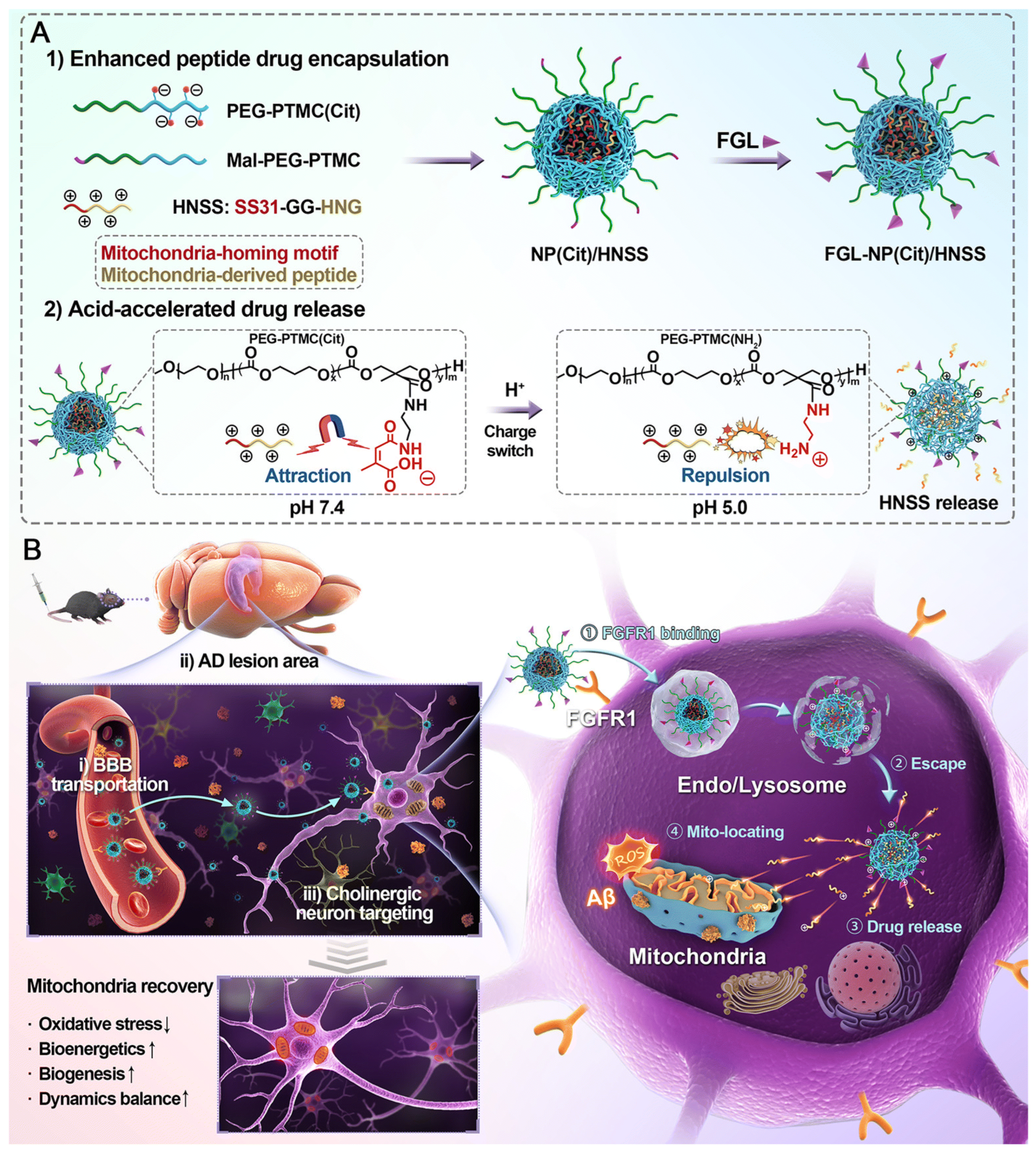 - Qian, K.; Bao, X.; Li, Y.; Wang, P.; Guo, Q.; Yang, P.; Xu, S.; Yu, F.; Meng, R.; Cheng, Y.; et al. Cholinergic neuron targeting nanosystem delivering hybrid peptide for combinatorial mitochondrial therapy in Alzheimer’s disease. ACS Nano 2022, 16, 11455–11472. [Google Scholar] [CrossRef]