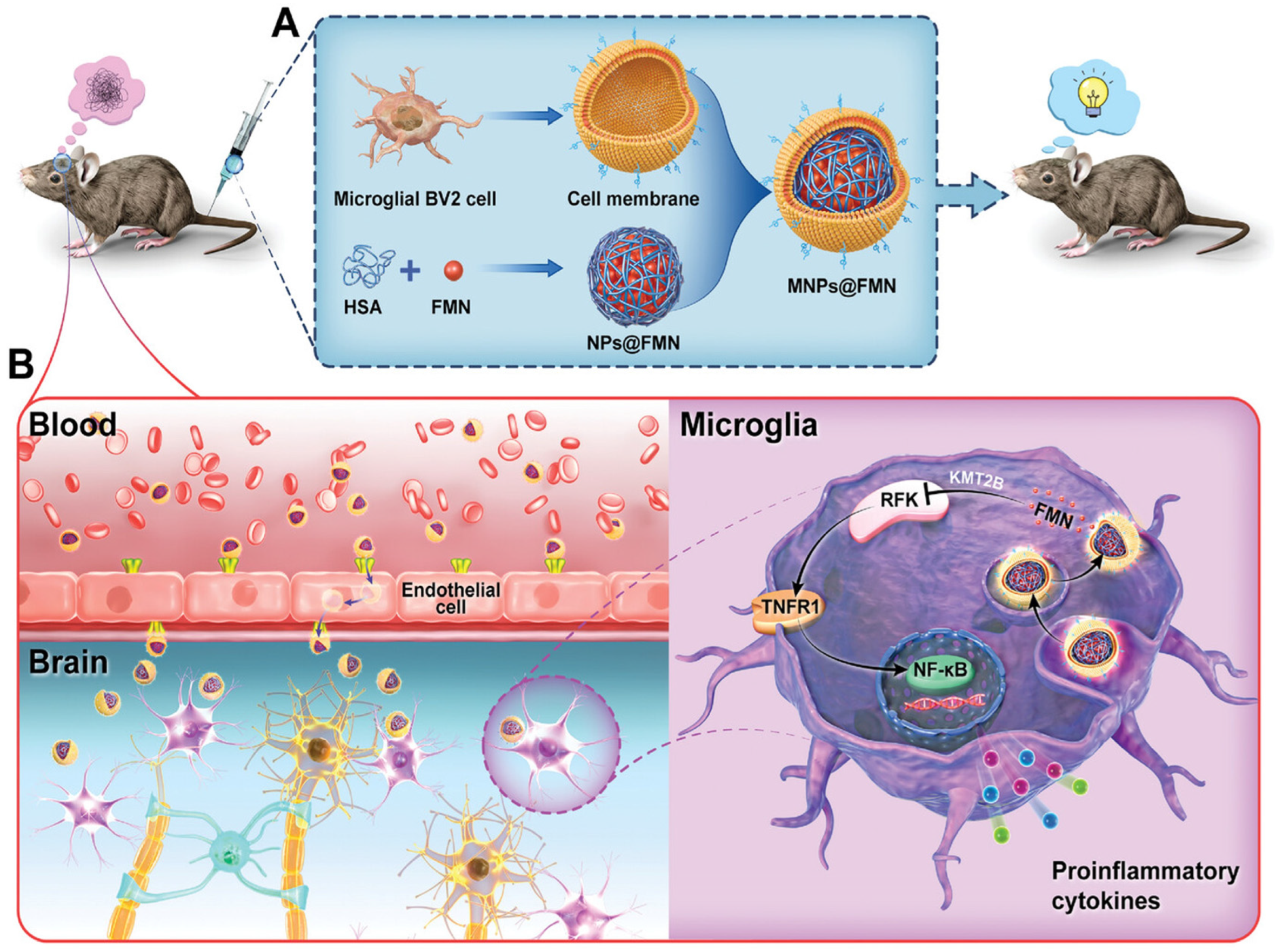 - Zhang, M.; Chen, H.; Zhang, W.; Liu, Y.; Ding, L.; Gong, J.; Ma, R.; Zheng, S.; Zhang, Y. Biomimetic Remodeling of Microglial Riboflavin Metabolism Ameliorates Cognitive Impairment by Modulating Neuroinflammation. Adv. Sci. 2023, 10, 2300180. [Google Scholar] [CrossRef] [PubMed]