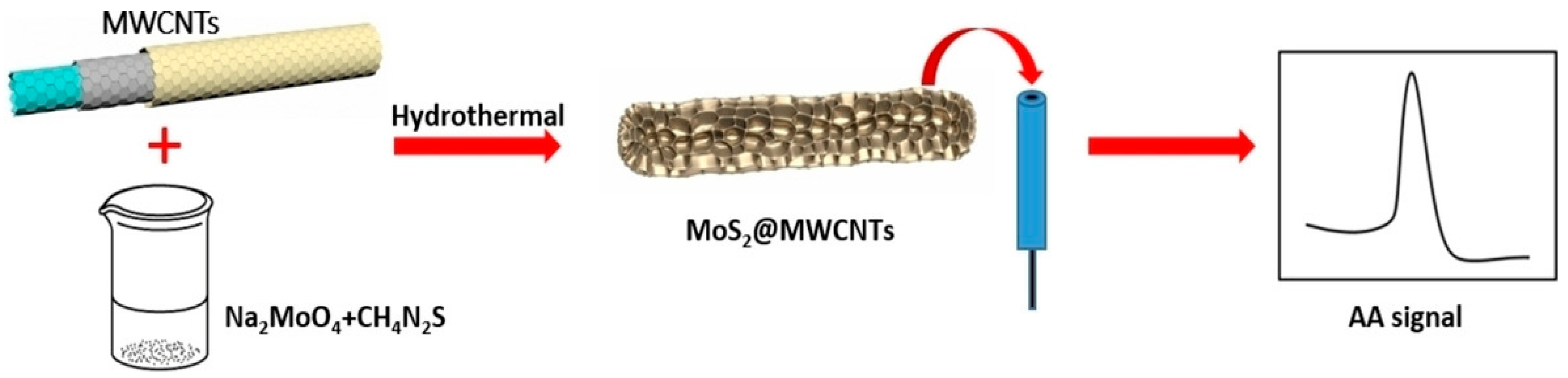 - Wang, Y.; Mamat, X.; Li, Y.T.; Hu, X.; Wang, P.; Dong, Y.M.; Hu, G.Z. Glassy Carbon Electrode Modified via Molybdenum Disulfide Decorated Multiwalled Carbon Nanotubes for Sensitive Voltammetric Detection of Aristolochic Acids. Electroanalysis 2019, 31, 1390–1400. [Google Scholar] [CrossRef]