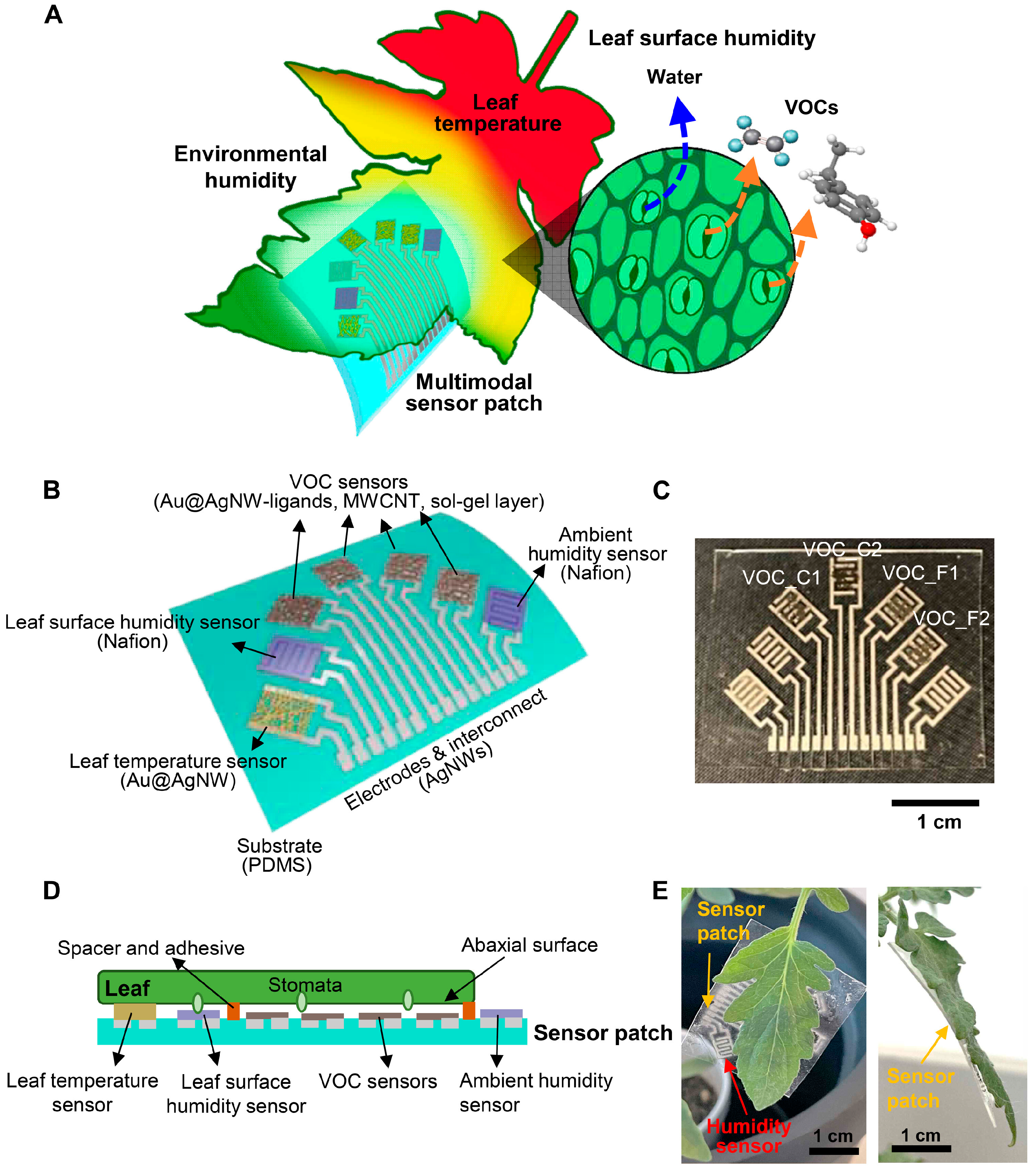 | Au@AgNWs interconnections and multi-walled carbon nanotubes (MWCNTs) embedded in a hydrophobic sol–gel layer made of methyltrimethoxysilane (MTMS) and tetramethyl orthosilicate (TMOS) [7]—2023—wearable | VOC, leaf surface temperature, relative humidity, leaf condensation, leaf strain. | Healthy and pathogen infected tomato plants | Chemoresistive sensors | Relative | High Environmental robustness, continuous monitoring, and system integration |