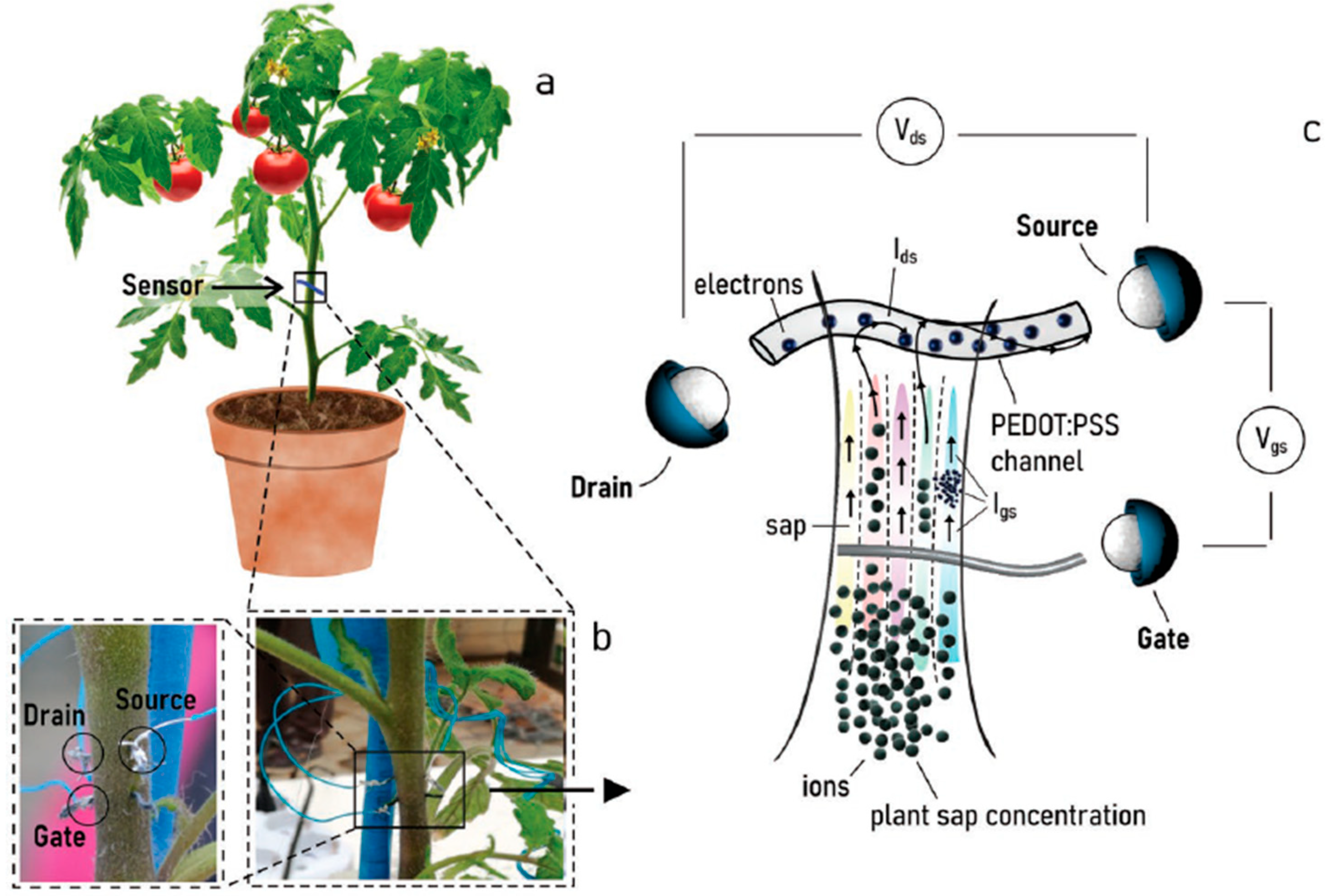 - Gentile, F.; Vurro, F.; Janni, M.; Manfredi, R.; Cellini, F.; Petrozza, A.; Zappettini, A.; Coppede, N. A Biomimetic, Biocompatible OECT Sensor for the Real-Time Measurement of Concentration and Saturation of Ions in Plant Sap. Adv. Electron. Mater. 2022, 8, 2200092. [Google Scholar] [CrossRef]