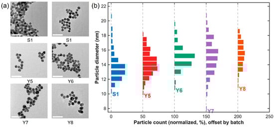 TEM micrographs and normalized particle-size distributions of AuNPs synthesized in batches S1, Y5, Y6, Y7, and Y8. (a) Representative TEM micrographs illustrating uniformly dispersed, quasi-spherical nanoparticles with minimal aggregation (scale bar = 50 nm). (b) Normalized particle-size distribution histograms centered between ≈13 and 16 nm, confirming narrow, symmetric size distributions and high batch-to-batch reproducibility. Each histogram is normalized to the total particle count (0–100%) to allow direct comparison among batches.