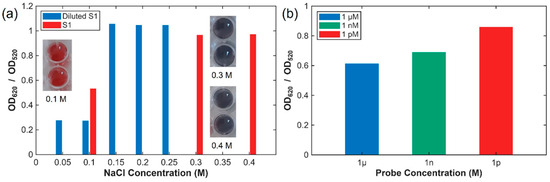 A secondary optimization experiment was conducted using NaCl concentrations ranging from 0.05 to 0.25 M with a diluted S1 AuNP batch (1.5 nM) to evaluate the effect of nanoparticle density (Figure 3a). Aggregation again occurred near 0.15 M NaCl; however, the onset shifted slightly toward lower NaCl concentrations at reduced AuNP levels due to decreased effective surface charge density and weaker electrostatic stabilization of the citrate layer. Based on these results, 0.15 M NaCl was selected as the standard condition for subsequent assays to ensure reproducible and sequence-specific colorimetric responses.