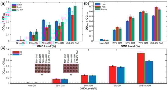 The performance of two different AuNP batches (Y6 and Y8) was evaluated at reaction times of 1, 5, and 10 min to assess their response and discrimination capability. Figure 4 summarizes the time-dependent colorimetric responses of two AuNP batches (Y6 and Y8) across different GMO levels. The performance of the batches was evaluated at reaction times of 1, 5, and 10 min to assess both kinetic behavior and discrimination capability. Panels (a) and (b) show the OD620/D520 ratios recorded at 1, 5, and 10 min for Y6 and Y8, respectively. For both batches, the absorbance ratio increased monotonically with increasing GMO content, indicating a concentration-dependent colorimetric response. Overall, Y6 and Y8 exhibited comparable trends and signal magnitudes across most GMO levels and reaction times. However, at the highest GMO content (≥98.4% w/w), Y6 displayed a slightly faster and stronger response, as evidenced by higher OD620/D520 values at early time points (Figure 4a), whereas Y8 reached similar levels more gradually (Figure 4b). The end-point comparison at 10 min (Figure 4c) confirms that both batches provide similar discrimination capability across GMO levels, with only marginal differences in signal magnitude. Overall, these results demonstrate that the assay enables rapid and semi-quantitative discrimination of GMO content within 10 min, while showing minimal batch-to-batch variation.