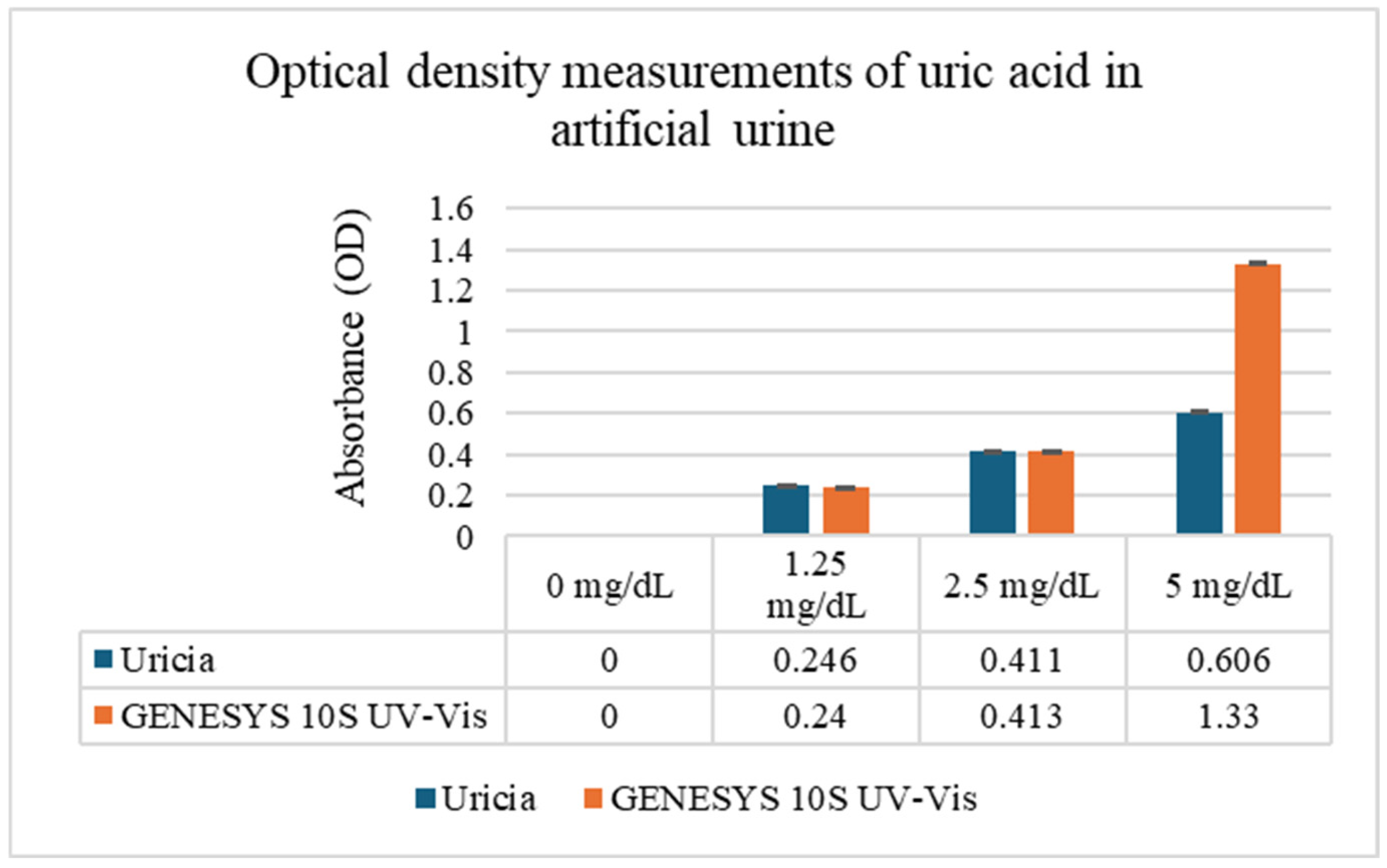 Uric acid solutions prepared in artificial urine (0–20 mg/dL) were evaluated using Uricia and the GENESYS 10S UV–Vis spectrophotometer (