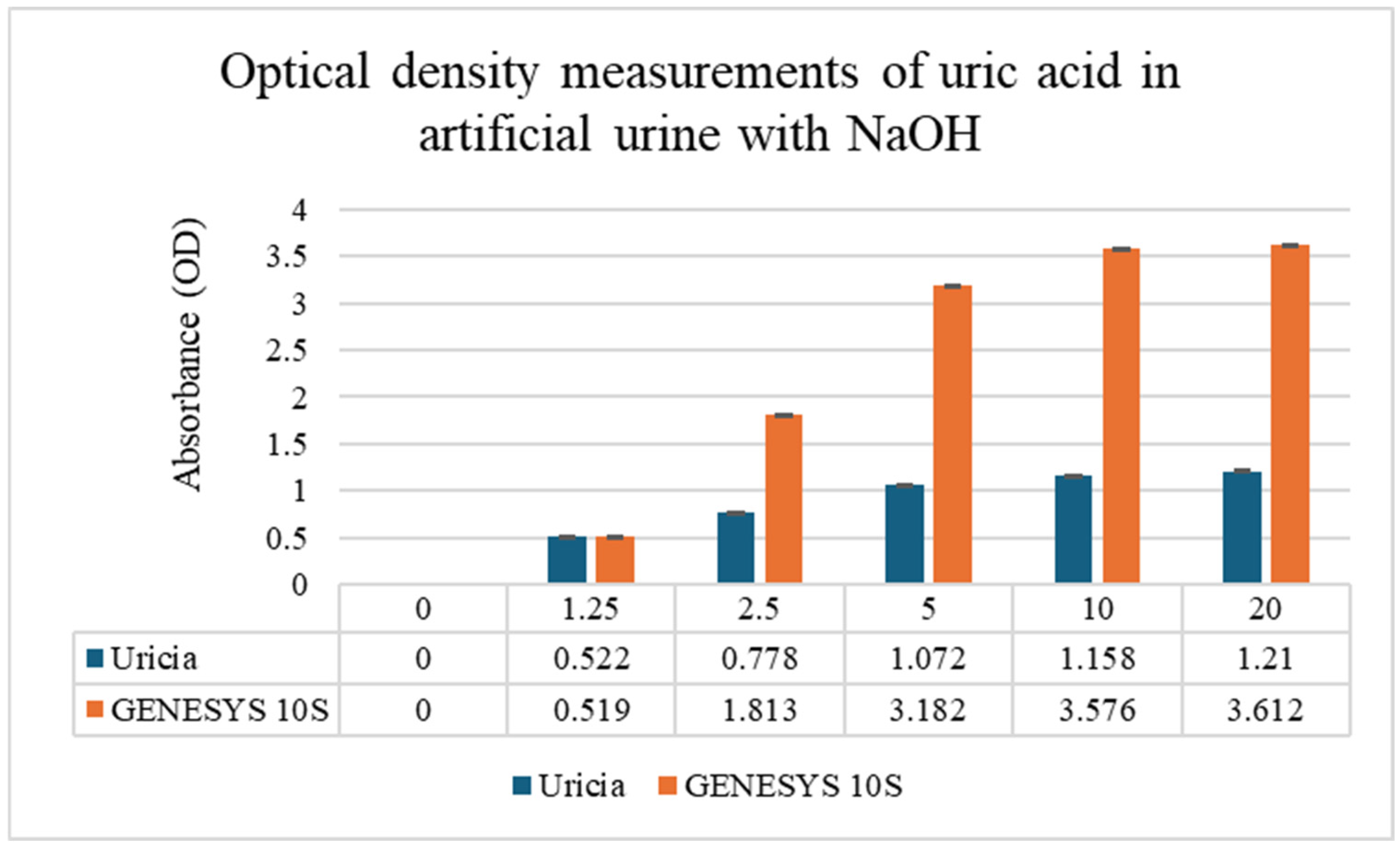 v) 1 M NaOH was empirically optimized. This level provided sufficient alkalinity to solubilize uric acid crystals up to 10 mg/dL without reaching a threshold that would induce the precipitation of other urinary solutes or significantly alter the optical properties of the matrix. GENESYS 10S supplied higher absolute OD values (given its fixed optical path length, stable lamp output, and more sensitive detector); however, with respect to the Uricia device, they were proportional and reproducible (