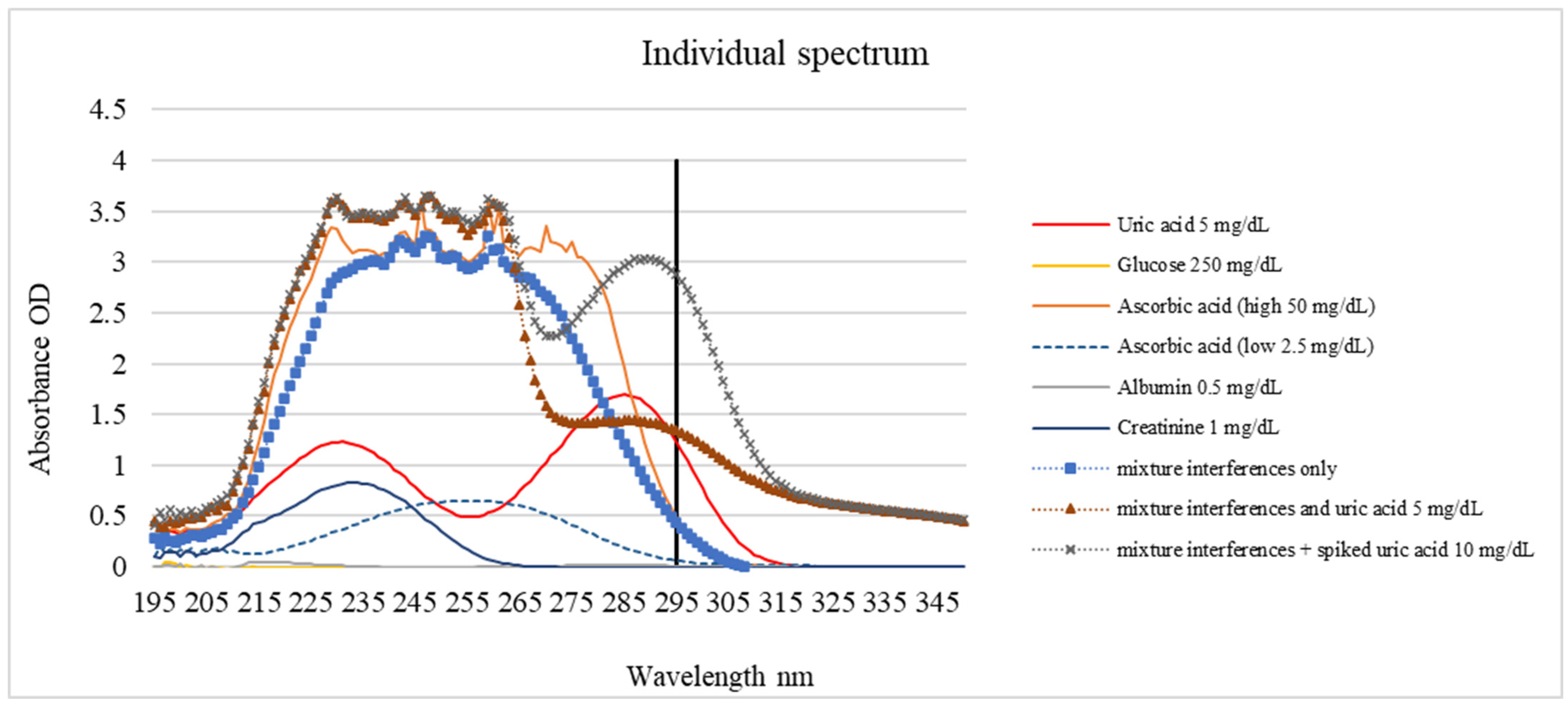 Figure 5, potential interferents, such as ascorbic acid and proteins, exhibit strong absorbance below 290 nm. By measuring at an off-peak wavelength of 295 nm, the device minimized spectral interference from the urine matrix while maintaining sufficient sensitivity for uric acid detection.