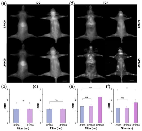 Motivated by the advantageous optical properties and biocompatibility of TCP, we compared its performance with that of ICG under in vivo fluorescence angiography. After intravenous administration of ICG or TCP (100 μL, 1 mmol/L in saline), the whole-body vasculature of C57BL/6NJ mice was illuminated under 808 nm laser irradiation. In the ICG-treated group (Figure 3a), the whole-body blood vessel signals were relatively weak in both the supine and prone positions under the long-pass 900 nm (LP900) filter of the NIR-I window, with a pronounced signal observed in the liver. Although ICG exhibited an emission tail for traditional NIR-II imaging under the long-pass 1000 nm (LP1000) filter, the vascular signals did not show significant improvement to allow clear observation. Quantitative analysis further confirmed that the SBR values for both filters remained below 1.5, with no statistically significant difference observed between them (Figure 3b,c). These results indicate that ICG’s emission tail beyond 1000 nm does not enhance the quality of vascular imaging. In contrast, whole-body fluorescent angiography was clearer in the TCP-treated group than in the ICG-treated group under both the LP900 and LP1000 filters (Figure 3d and Figure S20). Notably, under the long-pass 1300 nm (LP1300) filter, the whole-body blood vessel signals were significantly improved, while background signals from skin tissue were effectively reduced; additionally, greater detail was shown for small blood vessels, while the signal from liver tissue was reduced. Motivated by the high-quality imaging results obtained beyond 1300 nm, we quantified the SBRs of blood vessel signals under the three filters: under the LP1300 filter, SBR values reached 2.5, significantly higher than under the other two filters (Figure 3e,f). TCP can be used for high-contrast vascular imaging due to its PEGylated design, which ensures prolonged circulation and reduced liver uptake, in addition to its inherently low-background NIR-IIa imaging window, which minimizes tissue autofluorescence and scattering. Thus, TCP outperformed the clinical standard ICG by providing substantially brighter and sharper whole-body vascular images in the NIR-IIa window while simultaneously suppressing liver and skin background signals, resulting in SBR values that were more than 2-fold higher than ICG and confirming its superiority for NIR-IIa fluorescence angiography.