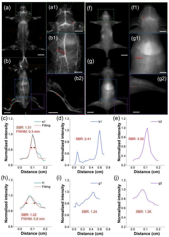 To address the clinical demand for detailed vascular imaging, we compared the high-resolution angiographic capabilities of both TCP and ICG after intravenous injection, focusing on the quantification of SBR and full-width-at-half-maximum (FWHM) in cerebral and peripheral vessels. Under the LP1300 filter, TCP-treated mice exhibited well-defined vasculature in the head, back, abdomen, and limbs (Figure 4a,b). In contrast, under the LP1000 filter, the vessels of ICG-treated mice were nearly undetectable due to pronounced skin autofluorescence (Figure 4f,g). Furthermore, we measured blood vessel SBRs in the representative mice by analyzing partially enlarged images from the in vivo fluorescent angiography. In mice injected with TCP, SBRs were as high as 3.32, whereas in mice injected with ICG, they remained below 1.26, demonstrating a 2.6-fold greater SBR in TCP under NIR-IIa imaging than that of ICG under traditional NIR-II imaging (Figure 4c–e,h–j). This demonstrates the benefit of the low background signal under the LP1300 filter, in contrast to conventional NIR-II imaging with the LP1000 filter. Furthermore, the microvasculature in the representative mouse head after TCP treatment demonstrated an accurate FWHM of 0.3 mm (Figure 4c) and distinct tiny vessels compared to the ICG-treated group, with an FWHM only accurate to 0.8 mm (Figure 4h). Overall, these findings demonstrate that TCP, with its unique emission range beyond 1300 nm, significantly enhances in vivo fluorescence angiography compared to the clinical standard ICG probe. Nevertheless, extended exposure times were necessary to acquire high-quality images; developing strategies to reduce acquisition time while maintaining image quality is therefore a critical priority in order to facilitate real-time imaging.