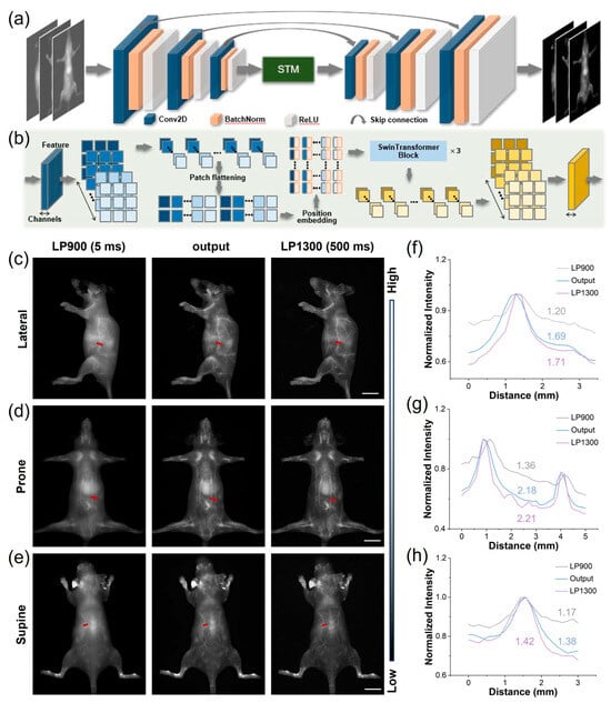 We processed LP900 (NIR-I) images of mice in multiple positions using the trained STM network, resulting in high-fidelity reconstructions that were subsequently compared with their ground-truth LP1300 (NIR-IIa) counterparts. The original LP900 images displayed indistinct subdermal vasculature, whereas the STM-enhanced images revealed a sharply delineated whole-body vascular network closely approximating the reference LP1300 images (Figure 5c–e); notably, despite this approximation, the images are not identical, indicating that the neural network did not simply memorize the results from the training set but also effectively generalized to previously unseen data. Subsequently, we performed SBR analysis on the same images (Figure 5f–h). The results demonstrated that the generated images exhibited significantly improved SBR values compared to the original NIR-I images. Furthermore, the SBRs of the generated images were generally close to those of the LP1300 images. These findings suggest that the STM neural network enhances the clarity and spatial resolution of NIR-I images through transformation, making them akin to long-wavelength NIR-IIa images.