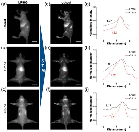 Deep learning of ICG from NIR-I to NIR-IIa. (a–c) NIR-I fluorescence images of a representative ICG-treated mouse acquired simultaneously from LP900 filter (exposure time: 5 ms, scale bar: 1 cm). (d–f) STM-transformed NIR-IIa-like images, corresponding to (a–c) (scale bar: 1 cm). (g–i) Cross-sectional fluorescence intensity profiles of blood vessels according to the red lines in (a–f), illustrating the enhanced vessel contrast achieved by deep learning reconstruction.