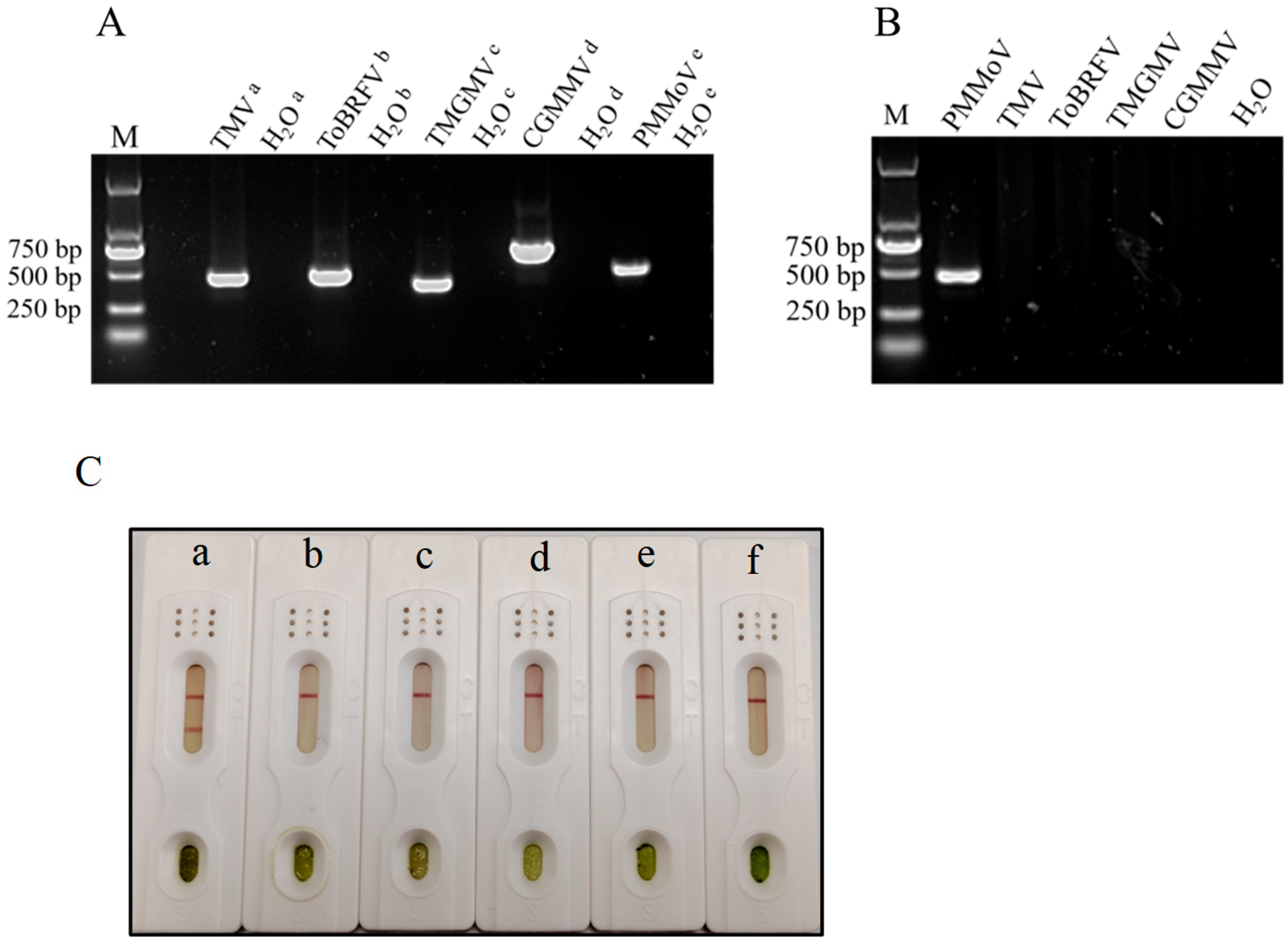 - Wang, Y.; Li, X.; Liu, Y.; Wang, X.; Zhou, G. Development of a simple and effective method for specific detection of pepper mild mottle virus. Acta Virol. 2009, 53, 21–27. [Google Scholar] [CrossRef] [PubMed]