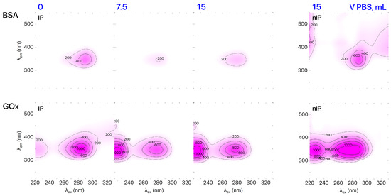 The final stage of imprinting is removal of template molecules from formed binding sites. Receptor purification was confirmed by plotting the excitation–emission matrix (EEM) using the results of 3D fluorescent spectroscopic analysis of the IPs solution. 3D fluorescence spectra were recorded via a Cary Eclipse (Agilent Technologies Inc., Santa Clara, CA, USA) fluorescent spectrometer. According to the EEM data (Figure 2), the pattern of IPs solution (1 mL) after elution with 15 mL of PBS was identical to the pattern produced for nIPs. UV–Vis spectroscopy (UV–1800 spectrophotometer, Shimadzu Co., Kyoto, Japan) was used to determine the concentration of the template in the eluent and evaluate the efficiency of template extraction from IP binding sites. We found that the IP purification rates were 91% and 98% for IPs based on BSA and GOx, respectively. It should be mentioned that there are some problems with the investigation of morphology of IPs. Despite that, we can see that imprinted polymer retains the native protein morphology at pH 3 as shown by TEM image provided in [23].