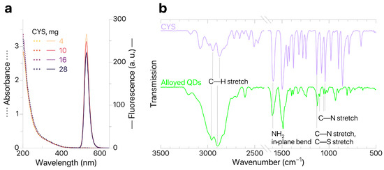 (a) QDs absorption and fluorescence; (b) ATR–FTIR spectra of CYS and QDs.