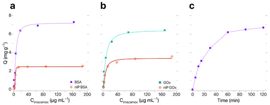 Sorption characteristics of IP–BIS modified by synthesized IPs were evaluated in accordance with the procedure described in [28]; the results of evaluation are shown in Figure 4a,b. Analysis of sorption isotherms obtained for IP–BIS modified with BSA- and GOx-based IPs showed that sorption capacity Q changed linearly until the concentration of imazamox equaled 25 μg mL−1. Maximal equilibrium values of Q and were observed for samples of IP–BIS modified with BSA-based IPs (Q = 6.38 mg g−1, = 2.6). The optimal time of imazamox extraction was 60 min (Figure 4c).
