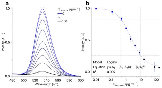 (a) QD fluorescence spectra in the presence of imazamox (0.12–160 μg mL−1); (b) calibration curve for imazamox detection by fluorescence quenching of QDs ().