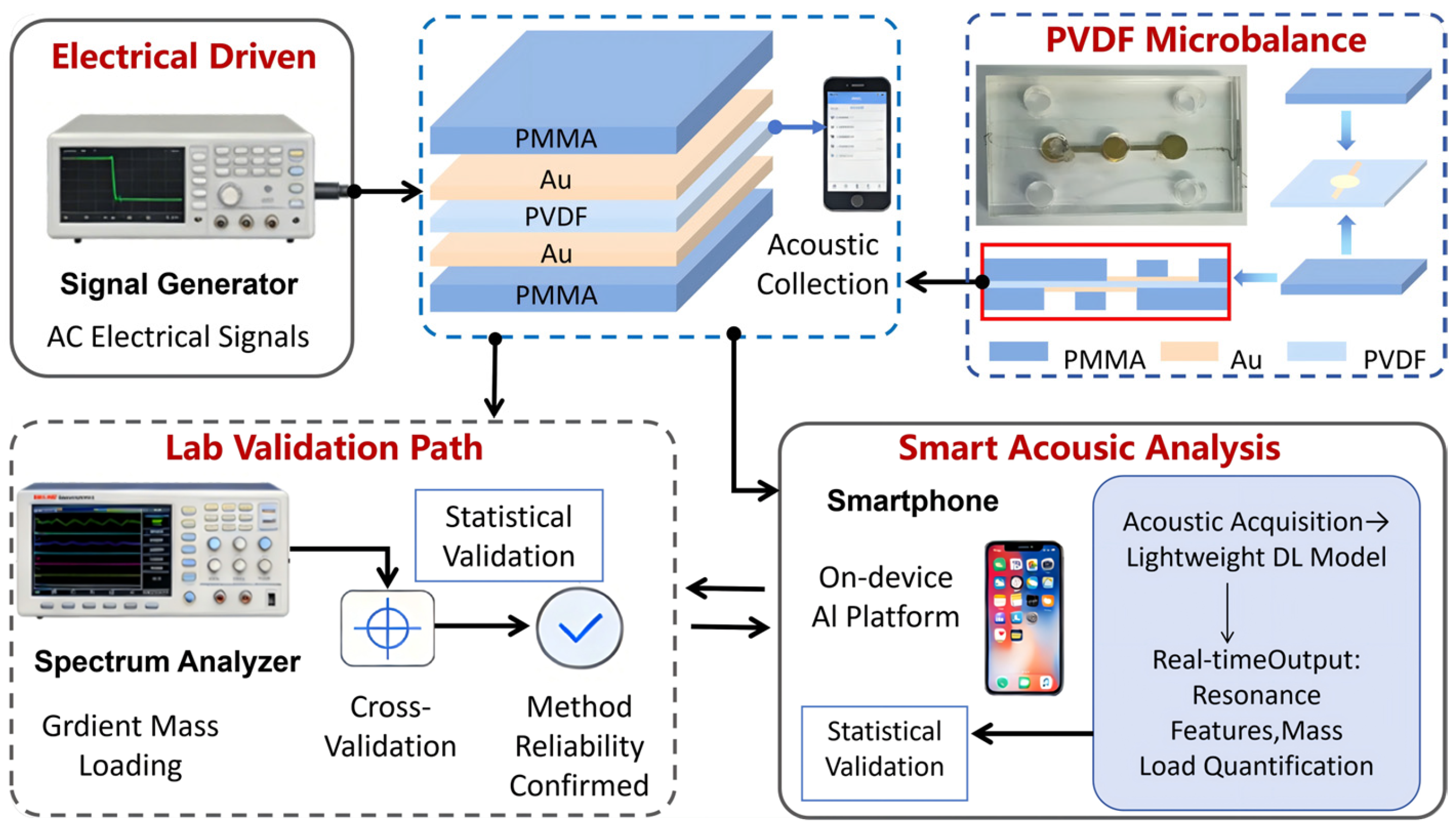 The key innovation of this study lies in the tripartite integration of sensing hardware (PVDF-based PTFM), edge-compatible algorithms, and smartphone-based acoustic acquisition. This decentralized paradigm eliminates the reliance on bulky laboratory instrumentation (e.g., network analyzers) and achieves analytical precision while reducing the cost, size, and operational complexity. Such portability holds transformative potential for resource-constrained settings, including rural clinics, field environmental monitoring, and wearable health diagnostics, effectively bridging the gap between centralized laboratory analysis and rapid on-site screening.