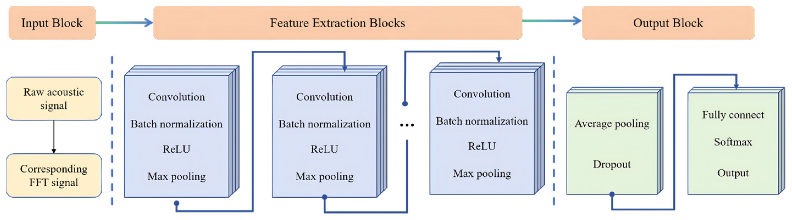 In this study, a DL algorithm architecture based on a CNN was developed, beginning with an input layer designed to receive raw acoustic signals along with their corresponding FFT signals. Subsequently, combination feature extraction blocks incorporating convolutional, batch normalization, ReLU, and max pooling layers were employed for feature extraction. An average pooling layer and a dropout layer were subsequently introduced to mitigate overfitting. The final output was achieved using a combination of fully connected, Softmax, and output layers. A schematic illustration of the CNN-based deep-learning architecture is shown in