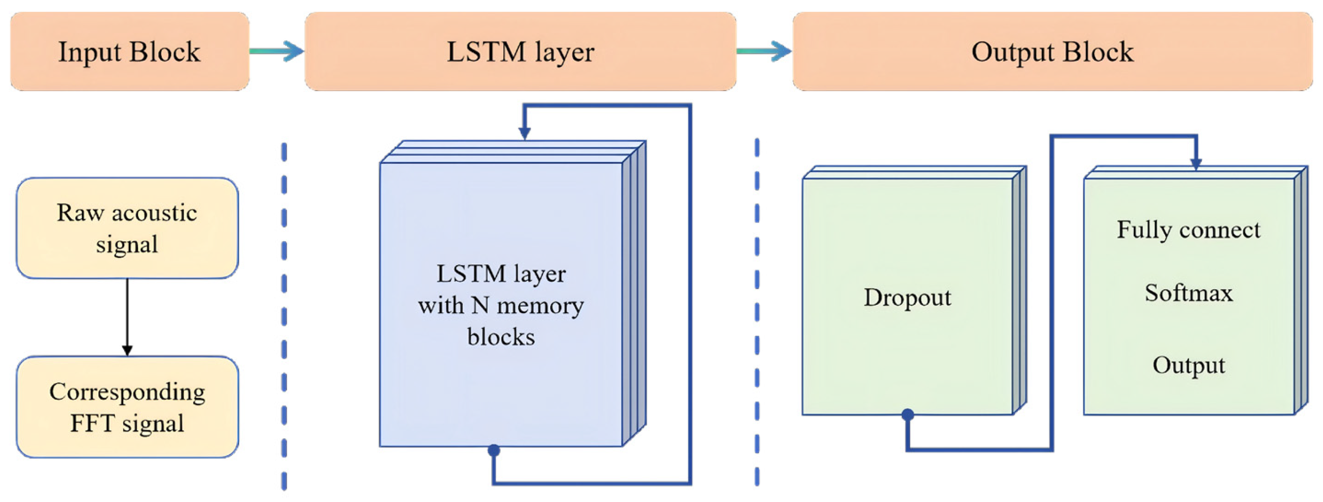 RNNs are adept at processing sequential data owing to their internal memory, which allows them to maintain temporal dependencies by backpropagating hidden states across time steps. Consequently, they are particularly well-suited for tasks involving time-series data. However, standard RNNs face challenges, such as the vanishing or exploding gradient problem, when learning long-term dependencies. LSTM networks address this issue through a specialized architecture comprising a cell state and three interacting gates: the forget gate, which determines which information to discard from the cell state; the input gate, which regulates the incorporation of new information; and the output gate, which decides which portion of the cell state to output. This configuration enables LSTM networks to learn and retain pertinent information in lengthy sequences effectively. LSTM networks are particularly valuable for directly analyzing time-varying or acoustic signals in sequence form, as they can capture the dynamic evolution and temporal correlations of signal patterns, thereby accurately classifying acoustic signals of varying load qualities. A schematic illustration of the LSTM-based DL architecture is shown in