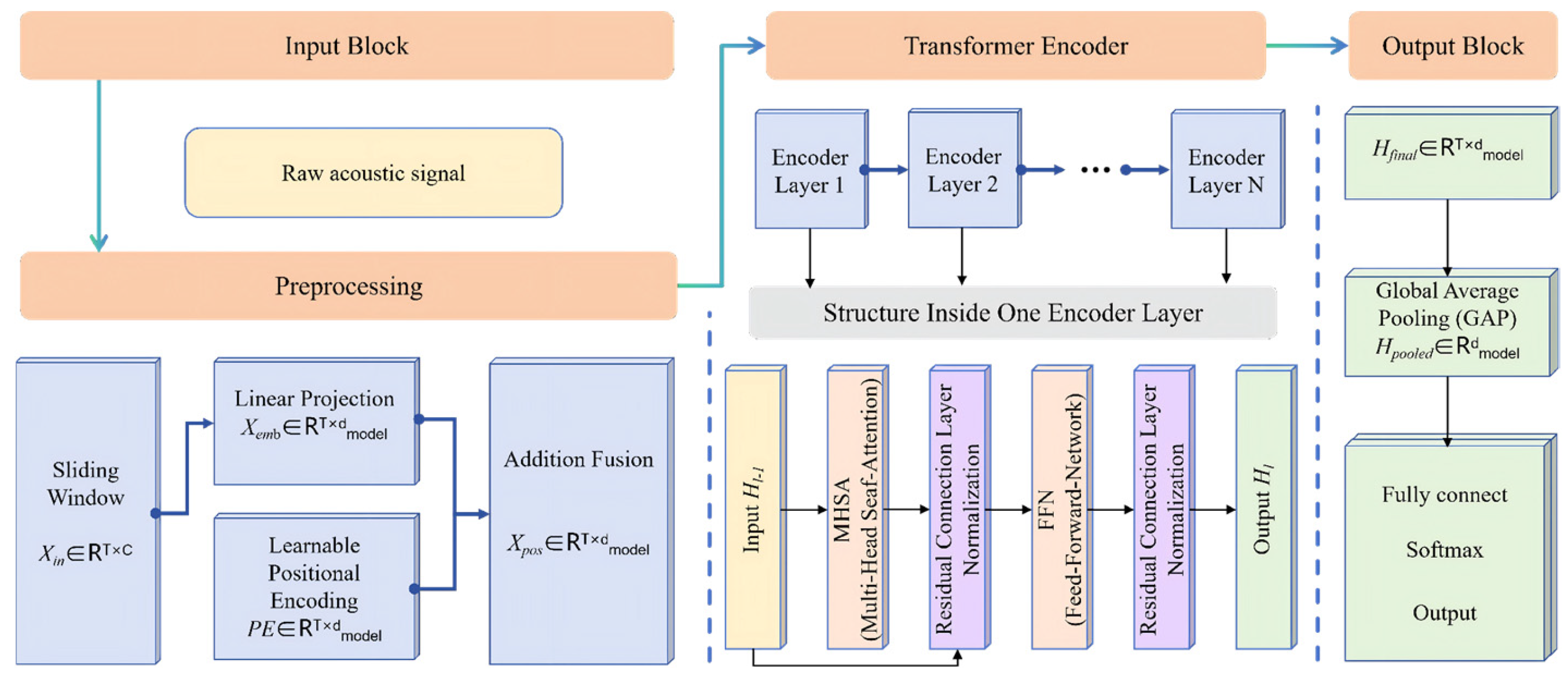 A Transformer-based model specifically tailored for the task of acoustic signal classification under varying mass loads was proposed. Initially, the original one-dimensional time series signals were subjected to preprocessing, utilizing the sliding window technique to segment them into fixed-length patches