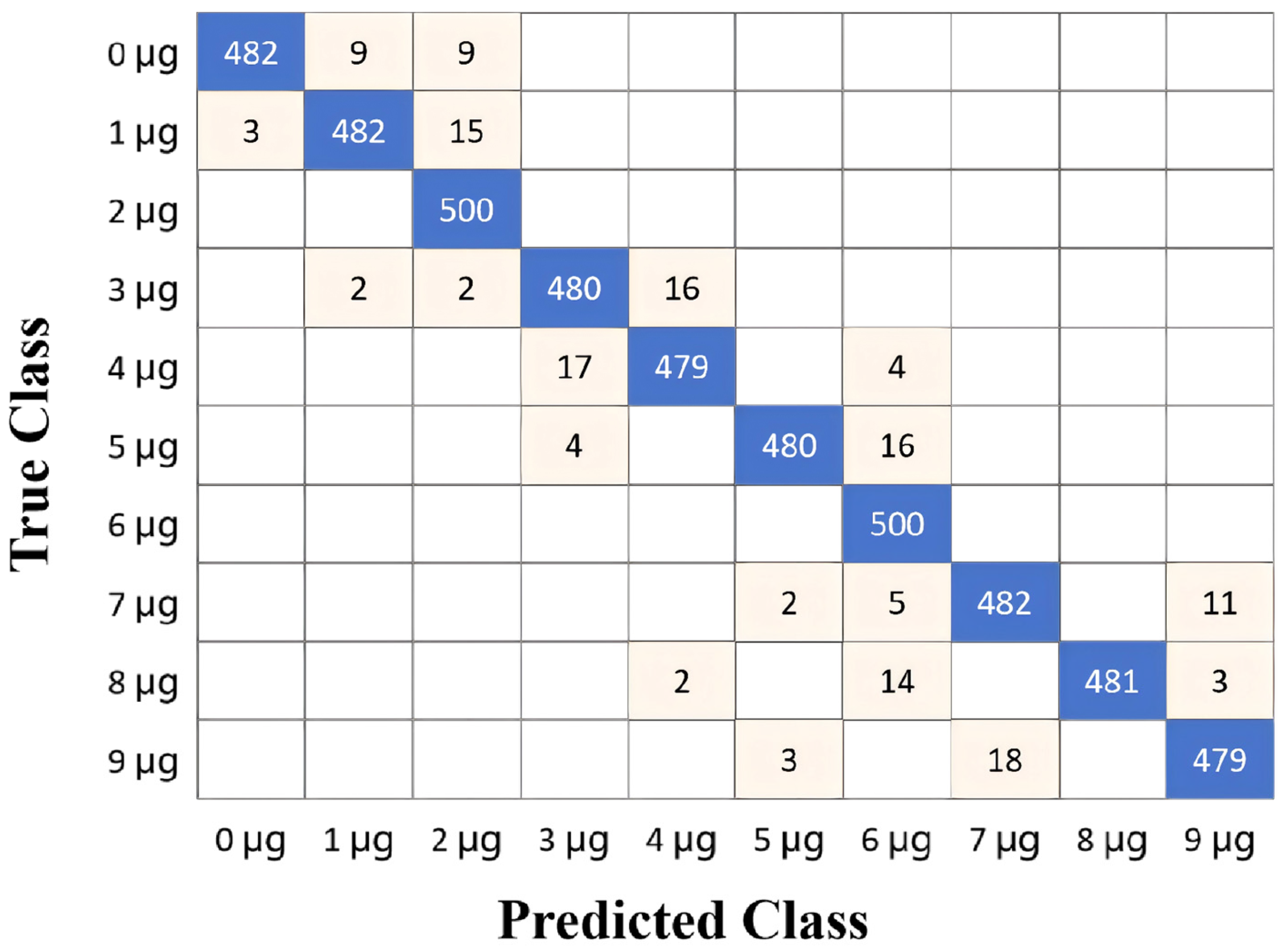 During the data processing phase, spectral analysis was performed on the acquired data, with both the raw acoustic waveforms and their corresponding frequency-domain representations serving as inputs. Subsequently, CNN, LSTM, and transformer models were employed to analyze the signals, culminating in classification. In the mass detection experiment, following the sensor calibration and determination of the baseline resonant frequency, a quantified volume of the analyte (e.g., single-stranded DNA) was deposited onto the sensing surface, as illustrated in