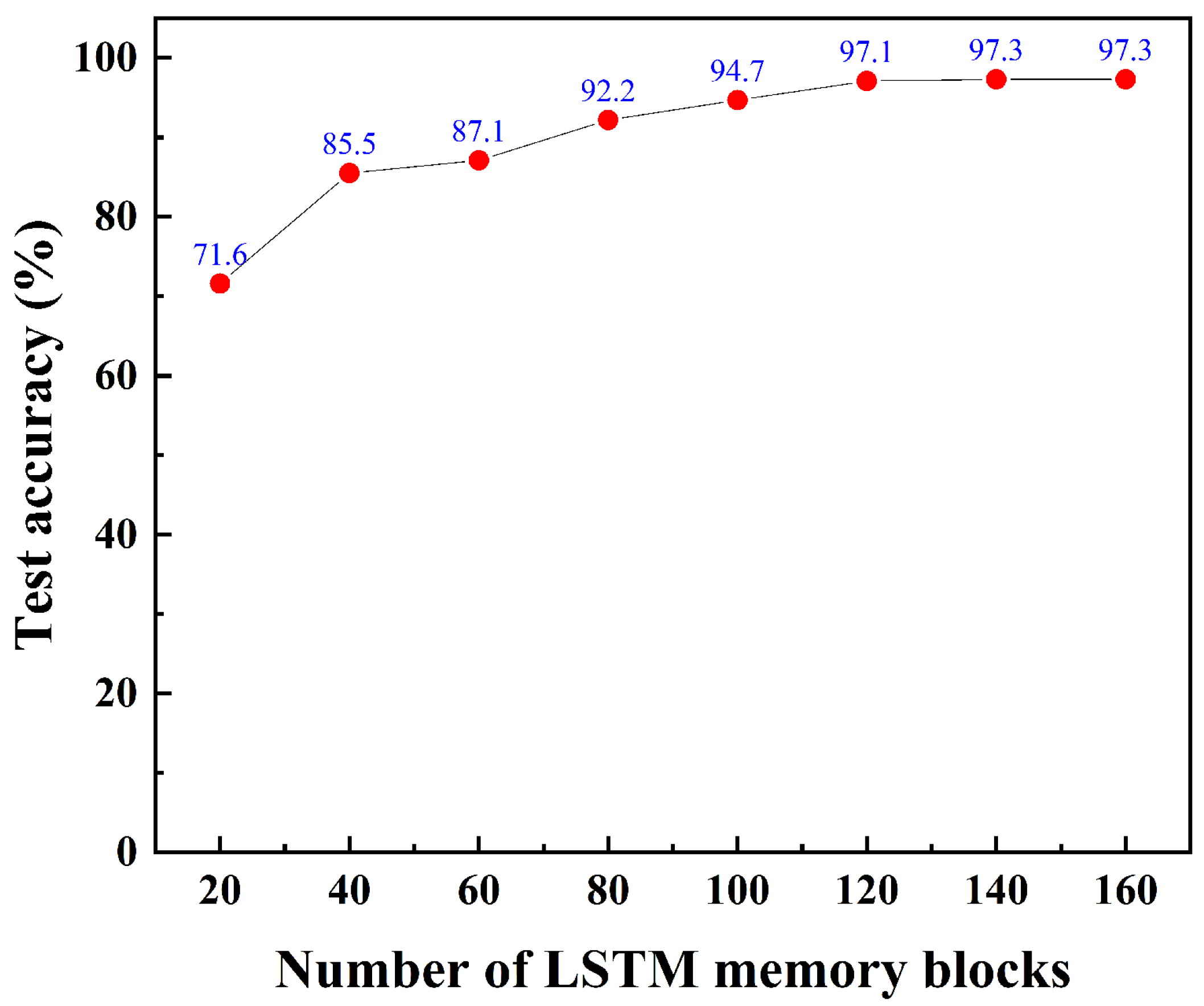 Figure 4. The DL algorithm architecture based on RNN begins with a sequence input layer for inputting the original vibration signal, akin to the CNN model and the corresponding FFT signal. LSTM layers with varying numbers of memory blocks (ranging from 20 to 160) were employed to extract features, and a dropout layer with a 20% dropout rate was utilized to prevent overfitting. Finally, a combination of fully connected, softmax, and output layers was used to produce the classification results. The Adam optimizer was employed to train the RNN deep network.