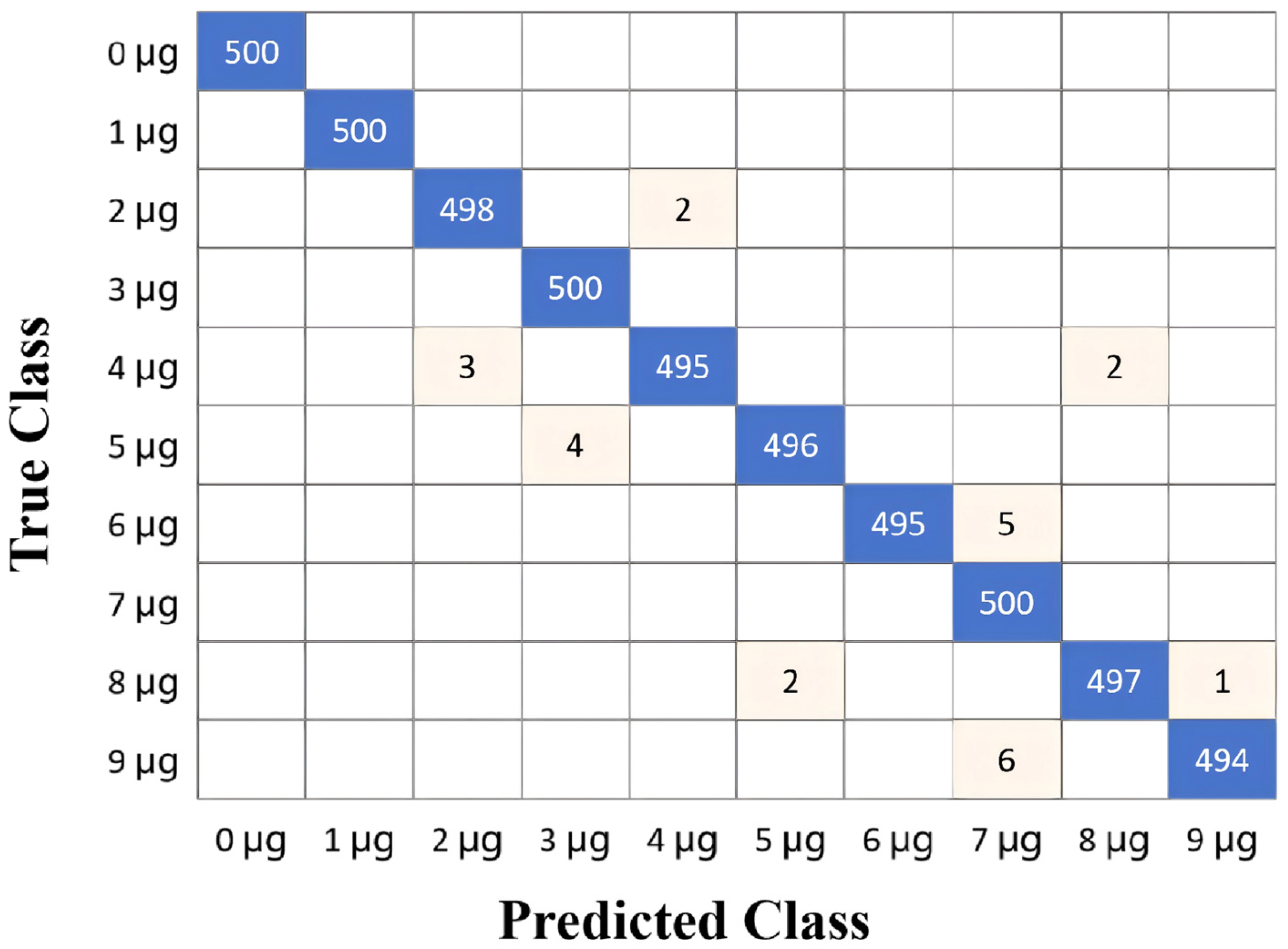 Three distinct DL algorithms that are readily deployable on smartphone terminals were employed to analyze the acoustic signals. For the DL algorithms, 2500 raw data samples of each mass load type were utilized, amounting to a total of 25,000. Each sample represents a 0.1 s segment of the acoustic signals. At a sampling rate of 48 kHz, this yields exactly 4800 individual data points per data sample. All samples were acquired as statistically independent measurements with rigorous procedural safeguards against bias or contamination and no sample shares temporal, procedural, or environmental context with another. Independence was ensured through: (i) separate experimental sessions conducted on non-consecutive days; (ii) randomized mass-load sequence per session; (iii) environmental monitoring (25 ± 1 °C, 50 ± 5% RH). Of these, 60% were allocated for network training, 20% for validation during training, and the remaining 20% for testing the accuracy of the network.