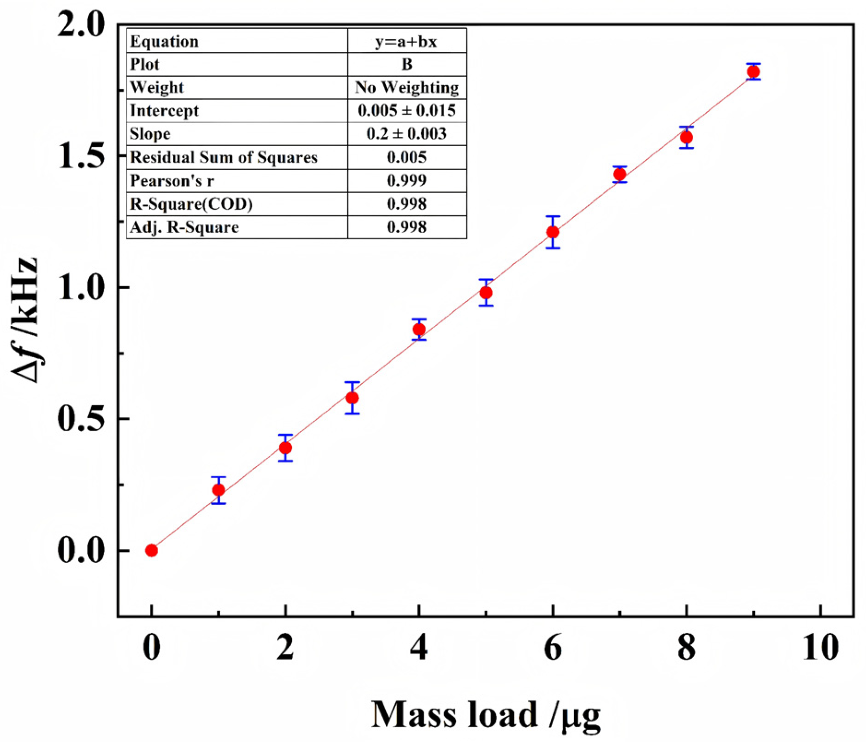 In the context of PTFM technology, PVDF films can be configured as mass-sensitive resonant elements operating in thickness-extensional vibration mode. When minute masses were adsorbed onto the sensing surface, the effective vibrating mass increased, leading to a reversible decrease in resonant frequency. Under ideal conditions where the added mass is small, the adhered layer is uniform and rigid, there exists a clear negative linear correlation between the frequency shift and the mass loading on the surface. Under ideal conditions wherein the adsorbed areal mass loading