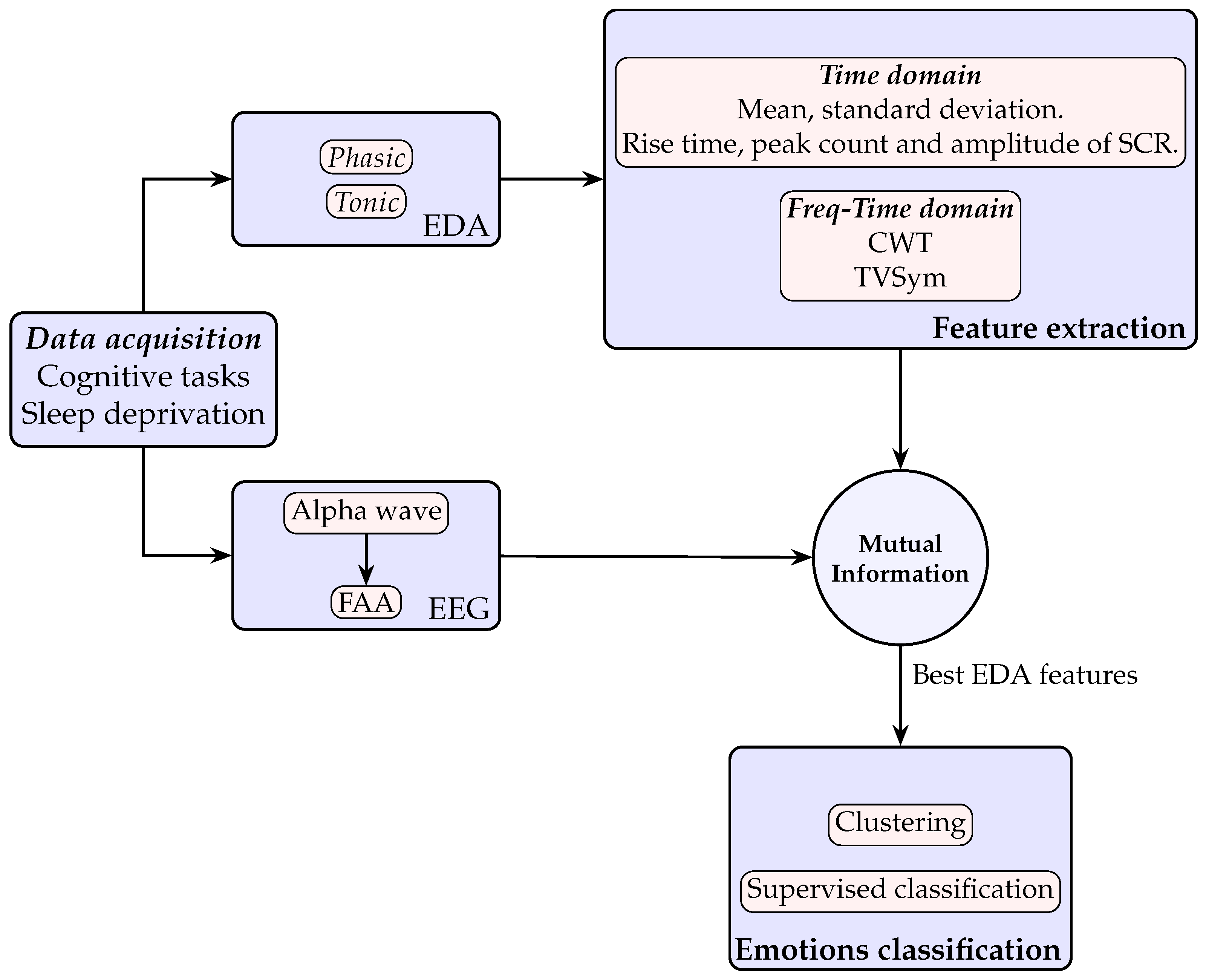 - Martínez Vásquez, D.A.; Posada-Quintero, H.F.; Rivera Pinzón, D.M. Mutual Information between EDA and EEG in Multiple Cognitive Tasks and Sleep Deprivation Conditions. Behav. Sci. 2023, 13, 707. [Google Scholar] [CrossRef]