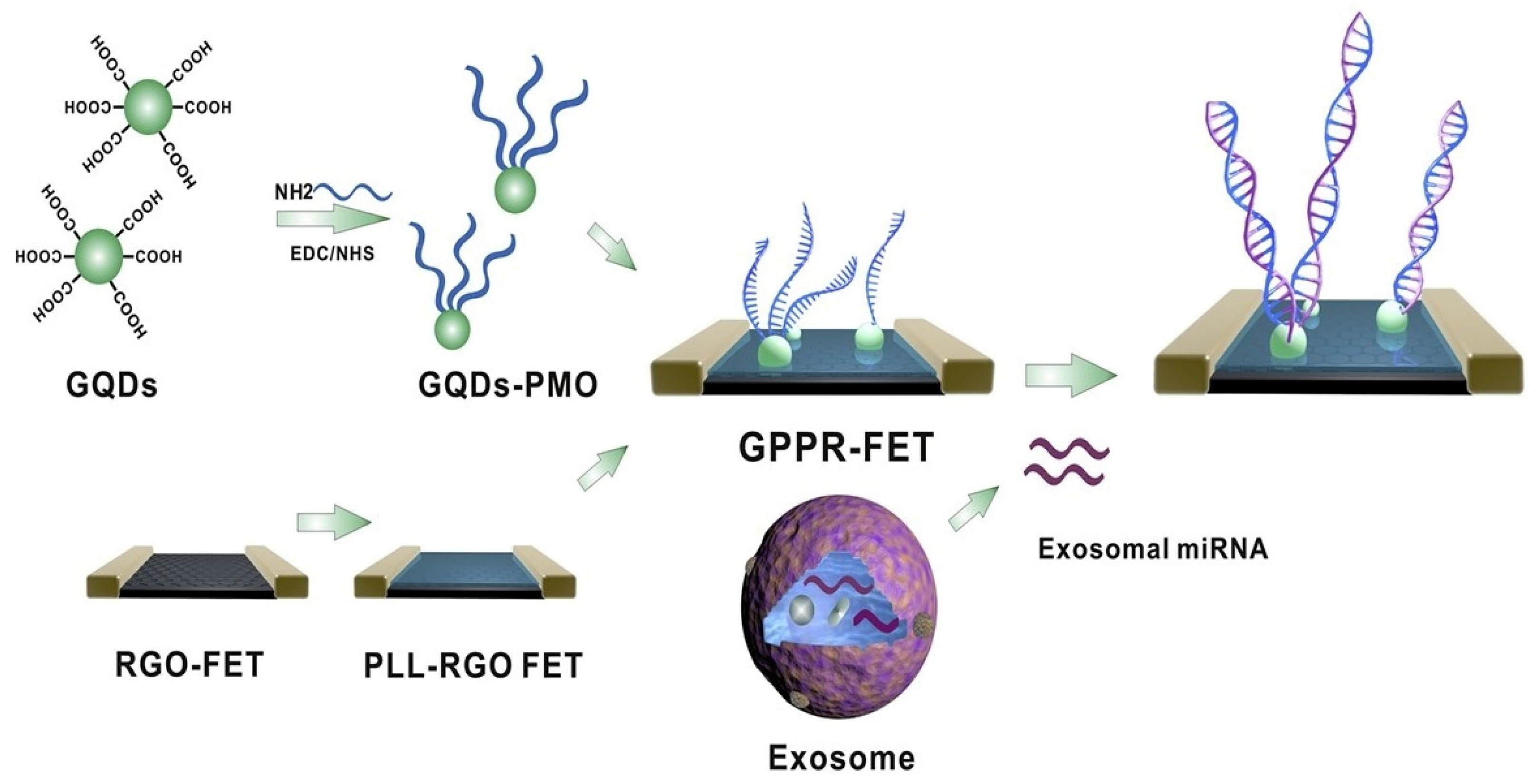 - Li, K.; Tu, J.; Zhang, Y.; Jin, D.; Li, T.; Li, J.; Ni, W.; Xiao, M.M.; Zhang, Z.Y.; Zhang, G.J. Ultrasensitive detection of exosomal miRNA with PMO-graphene quantum dots-functionalized field-effect transistor biosensor. iScience 2022, 25, 104522. [Google Scholar] [CrossRef]