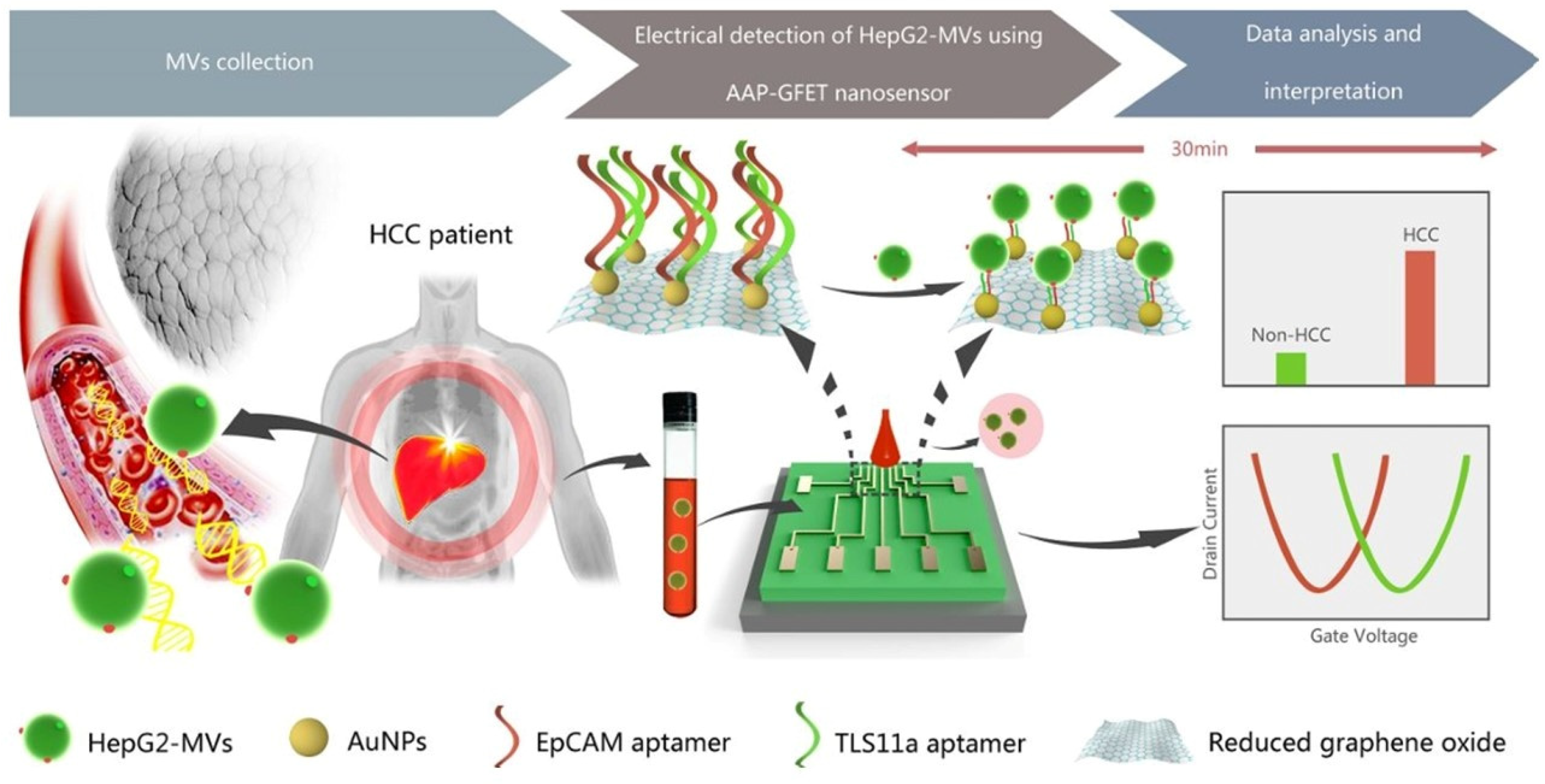 - Wu, D.; Yu, Y.; Jin, D.; Xiao, M.M.; Zhang, Z.Y.; Zhang, G.J. Dual-aptamer modified graphene field-effect transistor nanosensor for label-free and specific detection of hepatocellular carcinoma-derived microvesicles. Anal. Chem. 2020, 92, 4006–4015. [Google Scholar] [CrossRef]